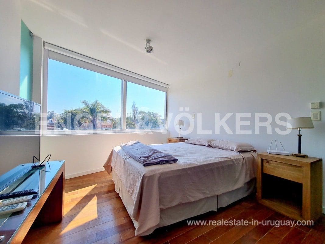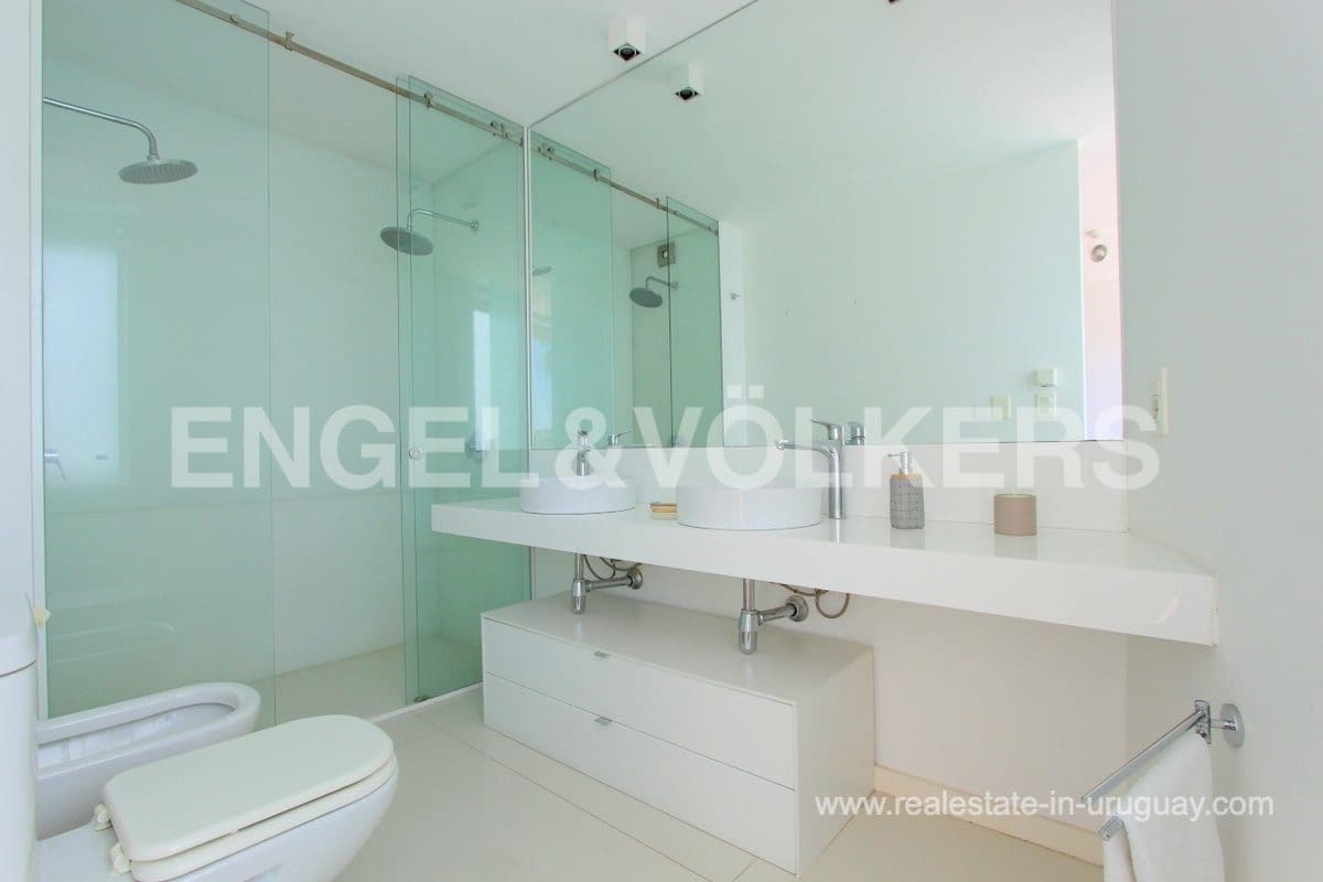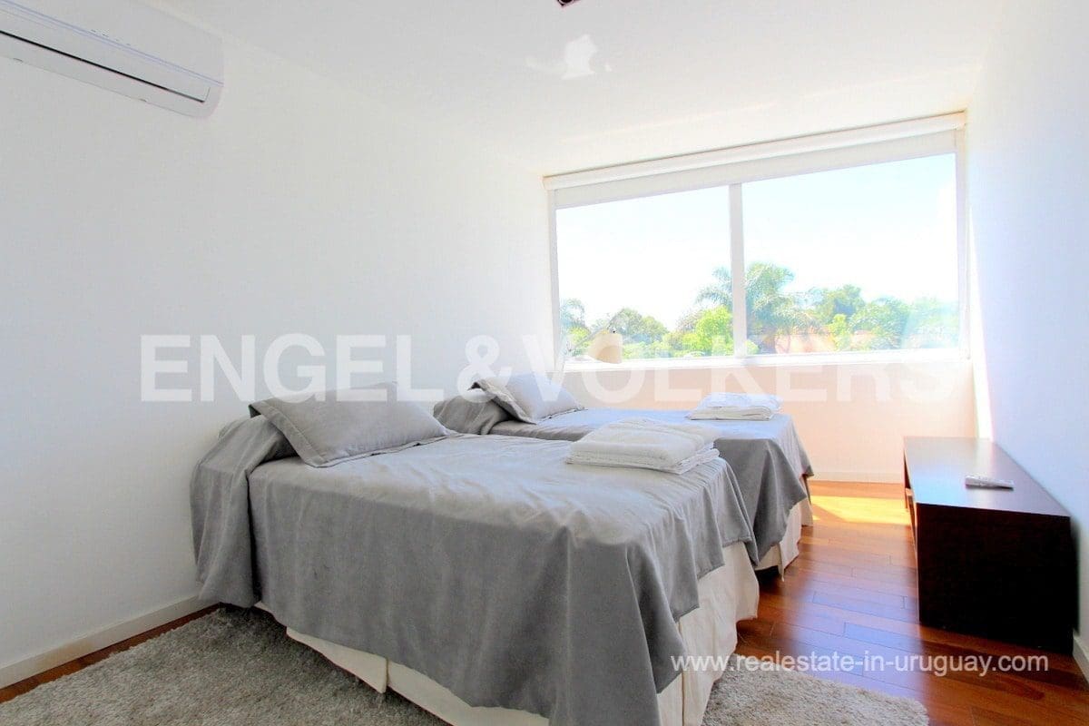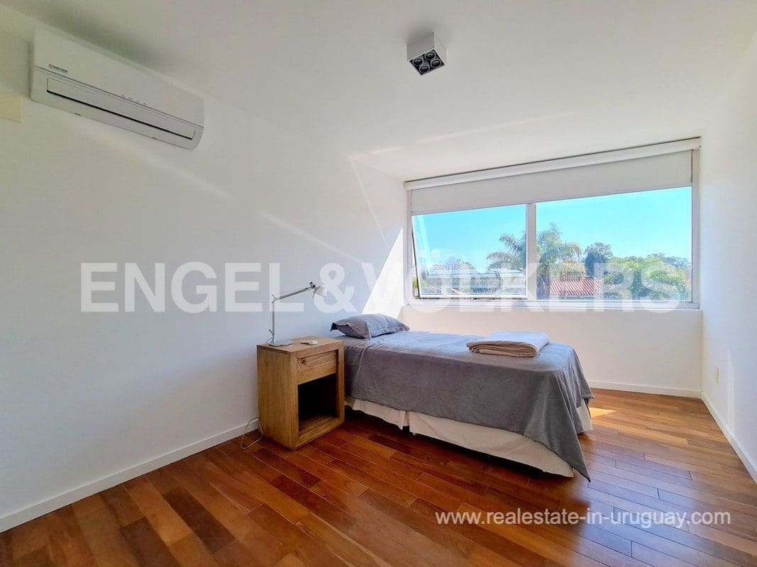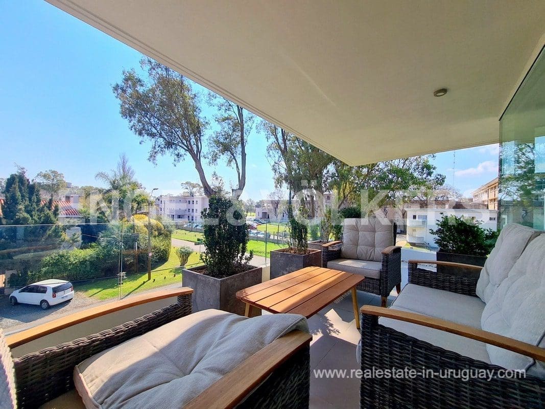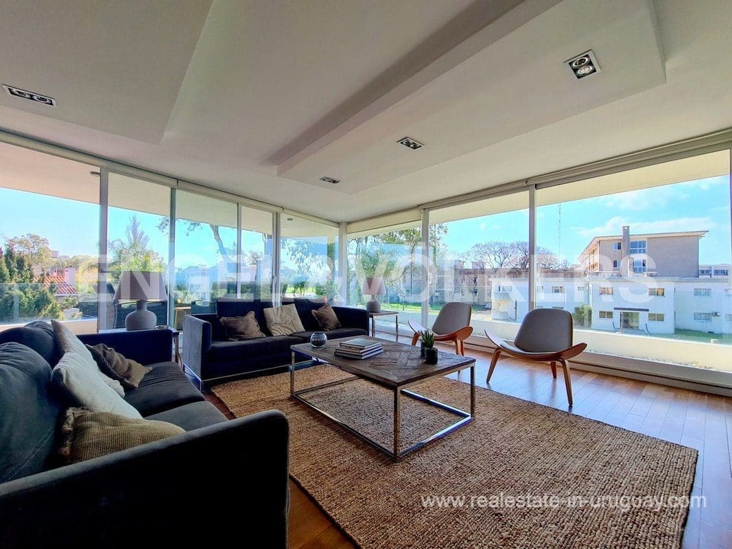 This modern Minimalist apartment in Carrasco welcomes us with a large living and dining room with a wood stove and a terrace with a barbecue. It has a defined kitchen with a maid’s bedroom en suite. The private area consists of three bedrooms, the master suite with a walk-in closet, and an extra bathroom that shares the secondary bedrooms. Underfloor electric heating plus air conditioning split. The apartment has an exclusive-use rooftop terrace with a barbecue. It includes two garages. The building has a barbecue and outdoor pool. This is a unique project where practice and beauty complement each other.