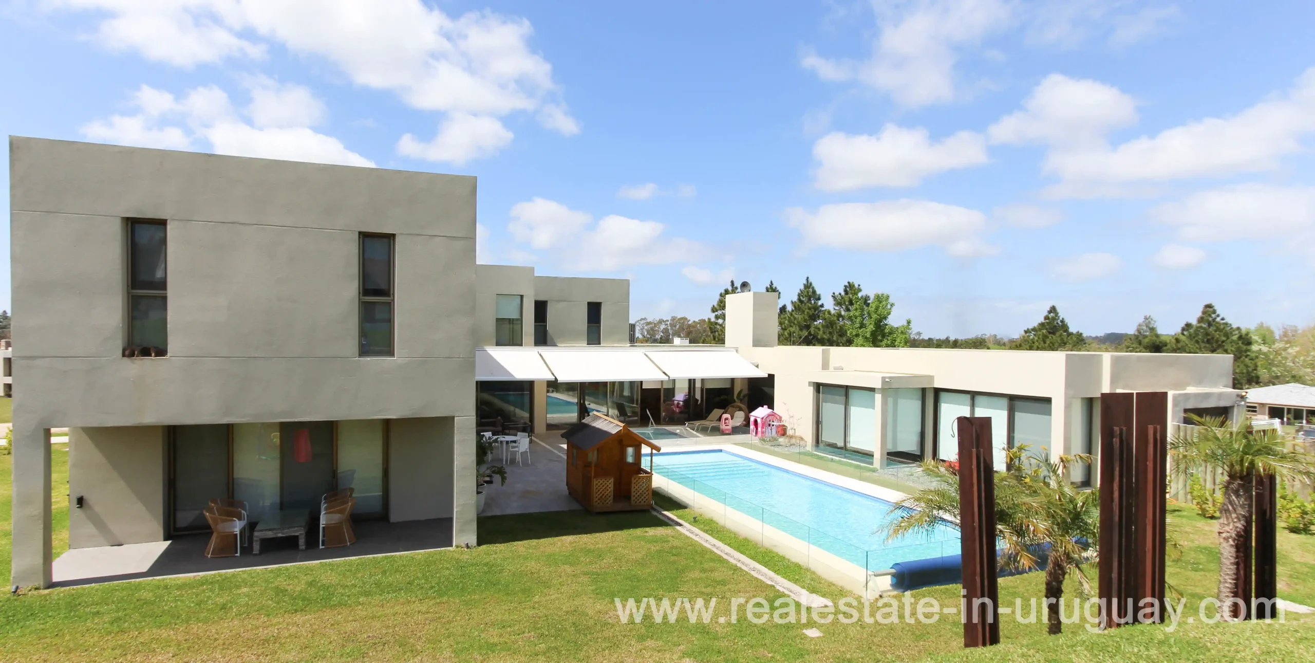 This modern villa is located in the most prestigious gated community in Montevideo. With 700 m2 of living space on a 2,187 m2 lot, this beautiful home in Carmel was built by Uruguayan architect Jaime Boxer, creating a modern yet familiar and individual style using only the finest materials. Built to meet today’s standards, it offers ample and comfortable space for family living. The design includes a 98 m2 formal living room with a wood-burning stove, which includes an open dining room, all with direct access to the terrace with a 12 x 4 m heated pool. The kitchen features an island as a communication center and includes all high-end appliances. The barbecue is integrated into the private living room. The gym, equipped with professional equipment, has a high-quality jacuzzi with a 4 x 2.5 m counter-current swimming system. In addition, there are 2 playrooms for children and a full bathroom on the ground floor. The upper floor comprises the master suite with a large dressing room and full bathroom with double sinks, a guest suite with private bathroom, and two further bedrooms that share a bathroom. In total, there are four bedrooms plus the bathroom. Air conditioning and underfloor heating throughout the house ensure a perfect temperature all year round. Hot water is provided by a power plant supplemented by solar panels. The house is connected to a Bang & Olufsen entertainment system. A large terrace that functions as an internal courtyard connects all areas of the house and allows for outdoor living during the summer months. The house also has a video security system.