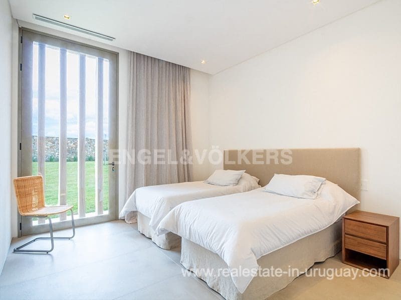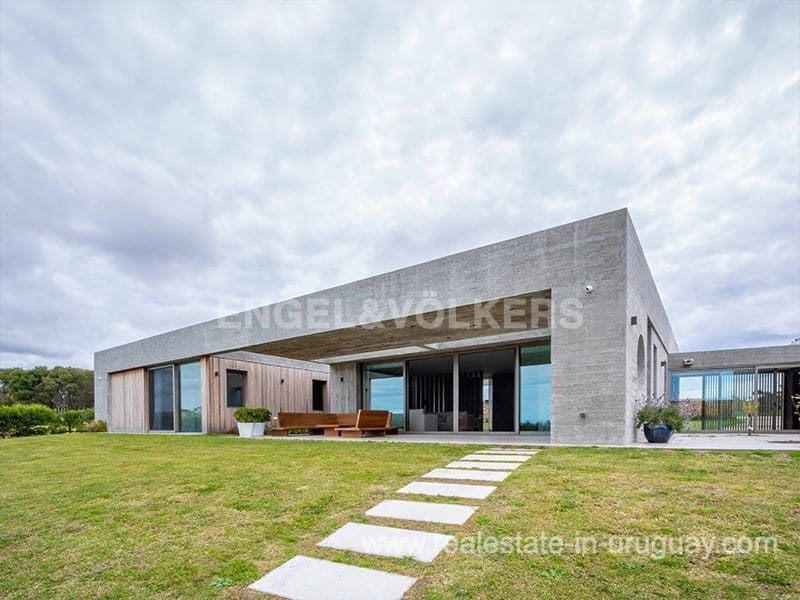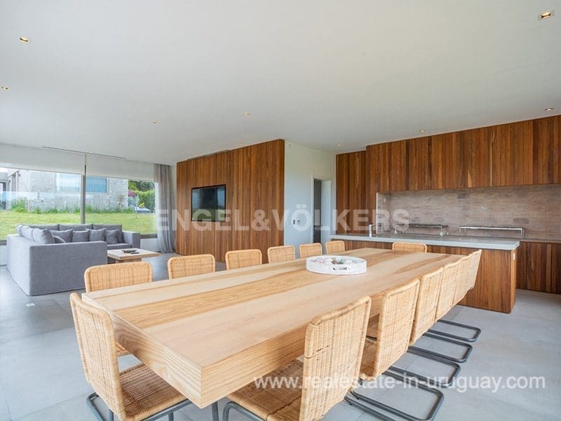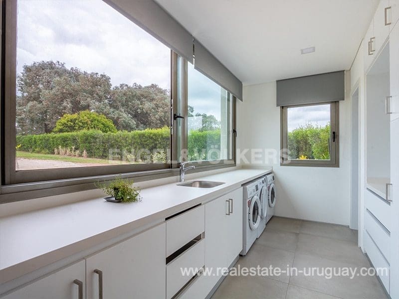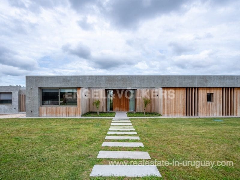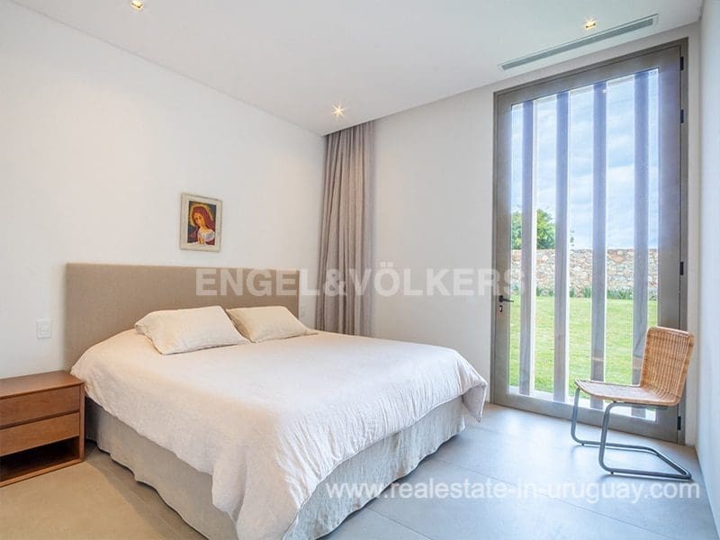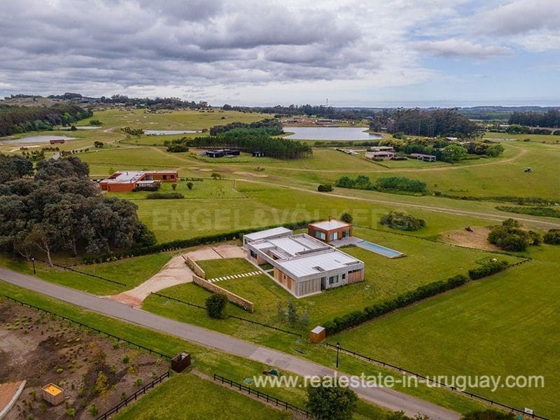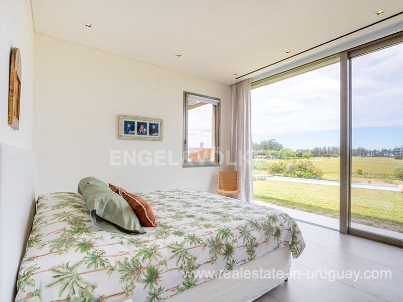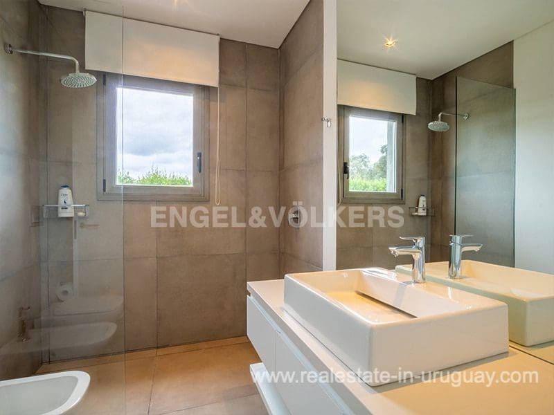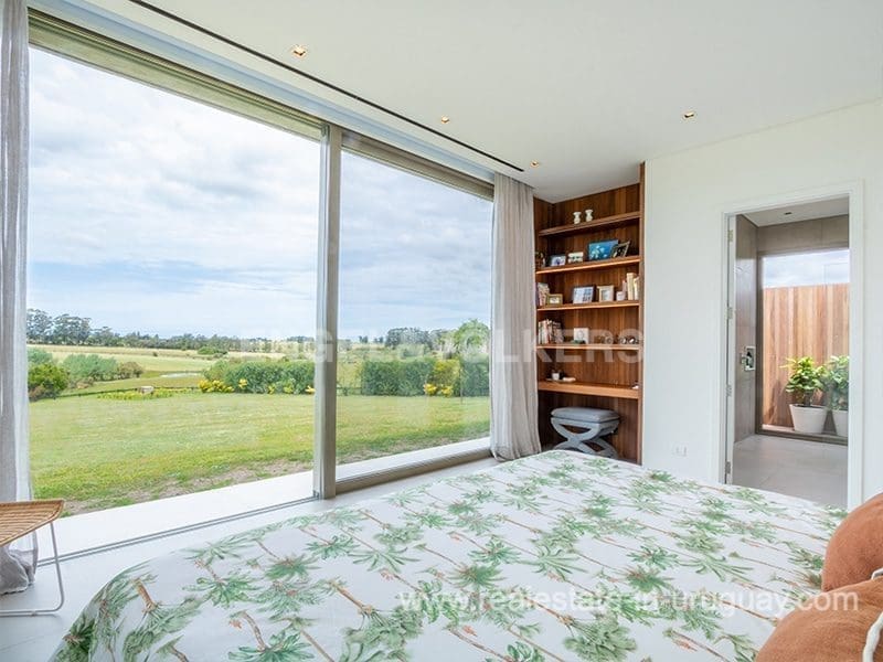 Located in the renowned Fasano complex featuring exceptional natural landscapes, contours designed in golf courses and polo fields, and organic vegetable gardens. This single-story modern house in Fasano Las Piedras has large windows and a sophisticated design. Living/dining room with panoramic views and high-performance wood-burning stove. Guest bathroom, two bedrooms with en suite bathrooms, plus two bedrooms with a shared bathroom and fully equipped independent kitchen. There is a covered deck with a living room for enjoying the unique and natural environment which characterizes Fasano. In the garden, there is an outdoor swimming pool next to an equipped BBQ with an independent kitchen and utility room. The property also comprises a guest bedroom with an en-suite bathroom, plus staff quarters. This property is the perfect choice for those seeking privacy, peace, nature, and quality time with the family, at the same time as being located just minutes from La Barra and the action in Punta del Este.