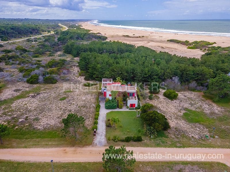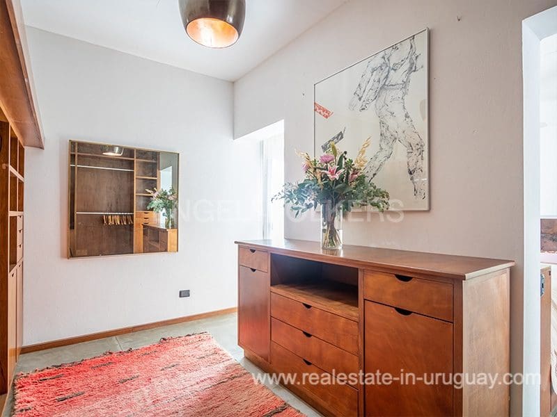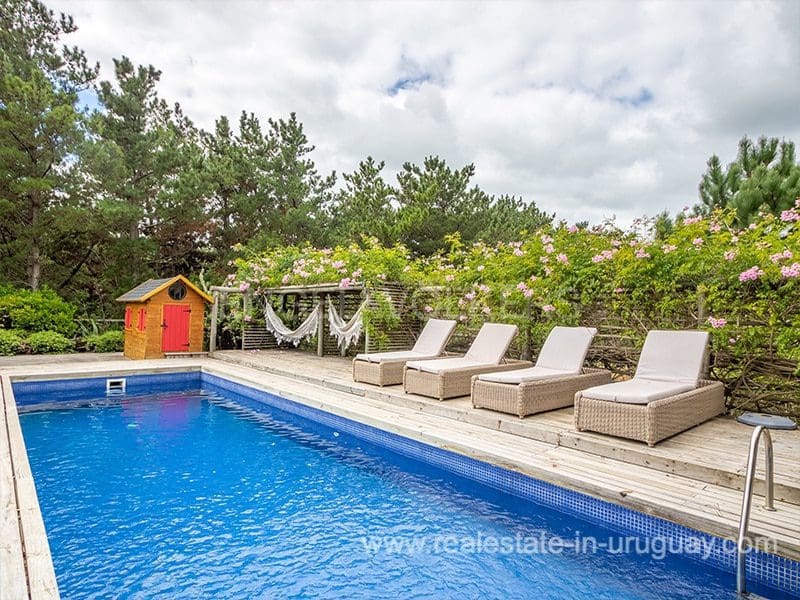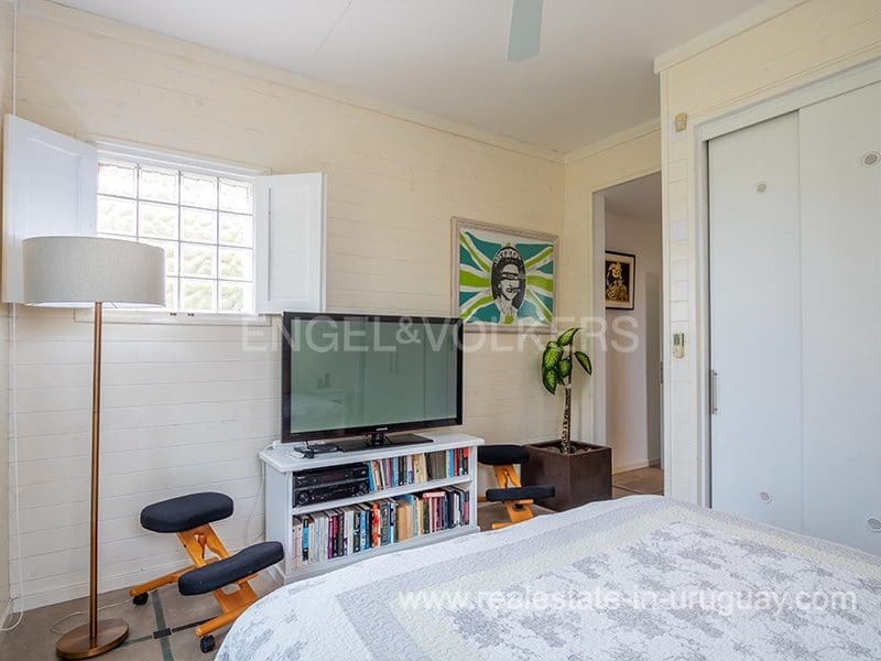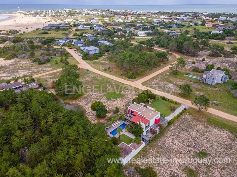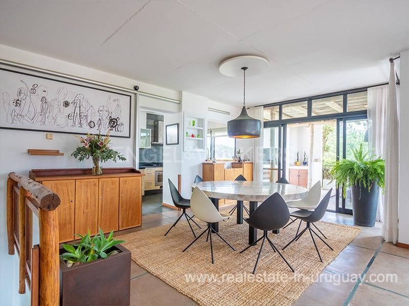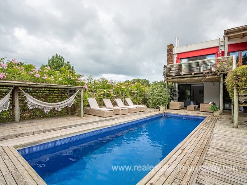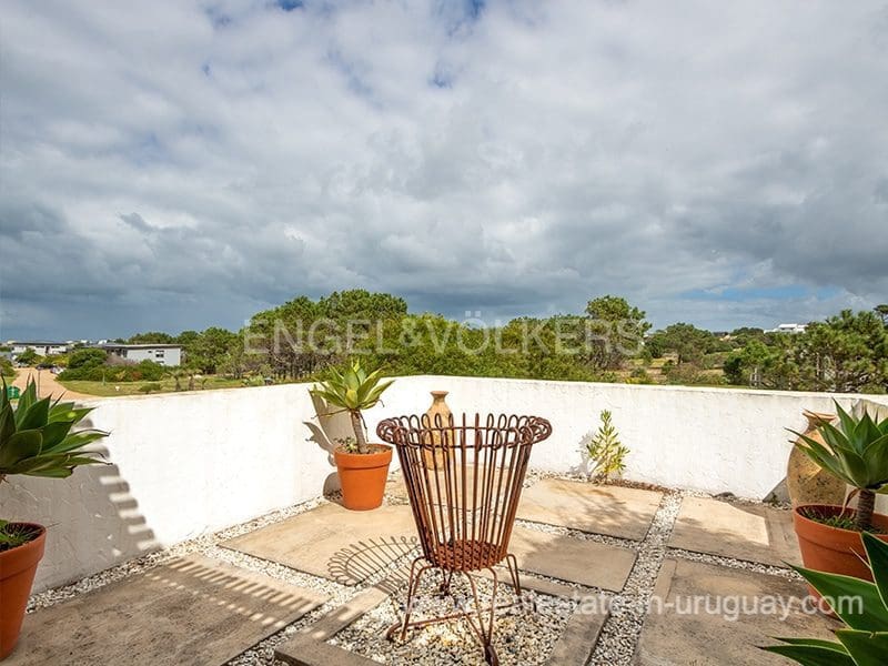 This two-story modern pool House Jose Ignacio is located within walking distance of the beach in a peaceful development with excellent houses. The entire social area is situated upstairs: living room with fireplace, dining room, kitchen, playroom, two terraces – one with BBQ/grill and covered dining room and the other with a lovely living room affording sea and sunset views. The ground floor comprises the master suite with a spacious full bathroom, walk-in wardrobe, fireplace and private terrace, plus three bedrooms with en suite bathrooms. The first floor, as well as the bedrooms, enjoy access to the heated swimming pool. There is a fully-equipped gymnasium apart from the house which boasts professional equipment, and a staff apartment with kitchen and utility room. This is a house which combines a rustic style with a linear design and all mod cons. Other details worth mentioning include 120m2 of terraces, sprinkler system, electric underfloor heating, alarm system and generator.