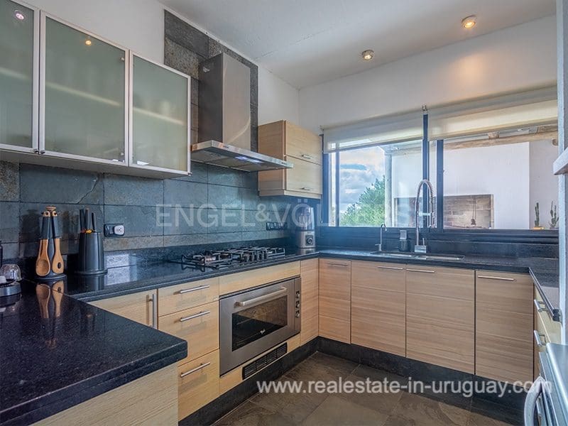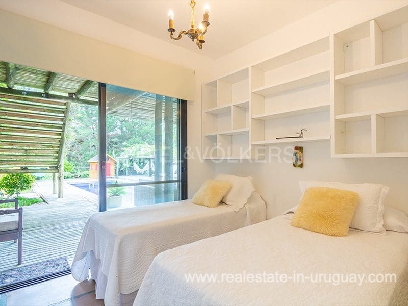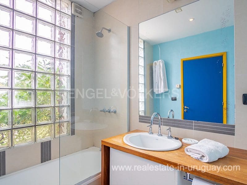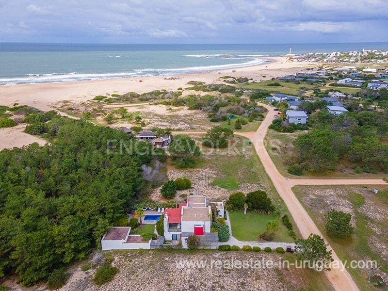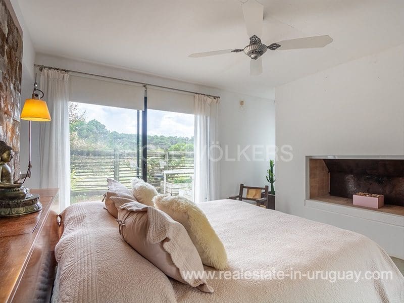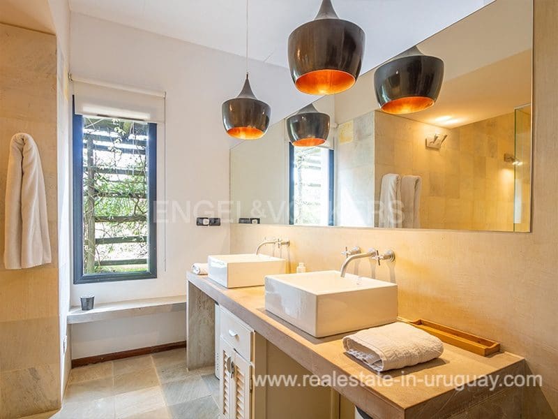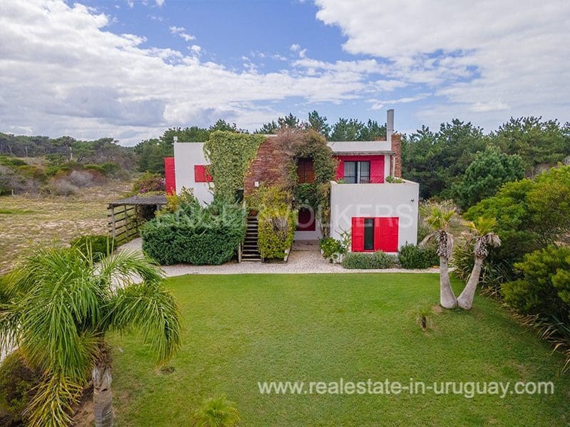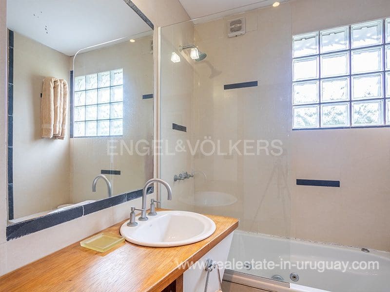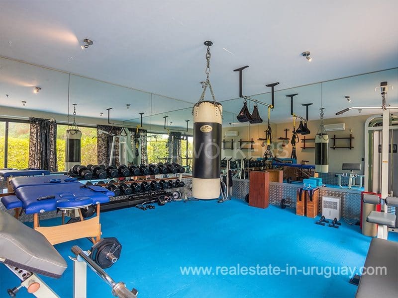 This two-story modern pool House Jose Ignacio is located within walking distance of the beach in a peaceful development with excellent houses. The entire social area is situated upstairs: living room with fireplace, dining room, kitchen, playroom, two terraces – one with BBQ/grill and covered dining room and the other with a lovely living room affording sea and sunset views. The ground floor comprises the master suite with a spacious full bathroom, walk-in wardrobe, fireplace and private terrace, plus three bedrooms with en suite bathrooms. The first floor, as well as the bedrooms, enjoy access to the heated swimming pool. There is a fully-equipped gymnasium apart from the house which boasts professional equipment, and a staff apartment with kitchen and utility room. This is a house which combines a rustic style with a linear design and all mod cons. Other details worth mentioning include 120m2 of terraces, sprinkler system, electric underfloor heating, alarm system and generator.