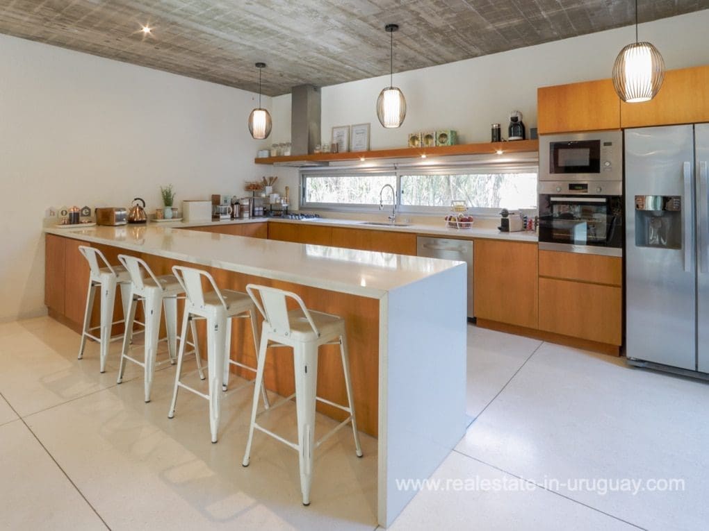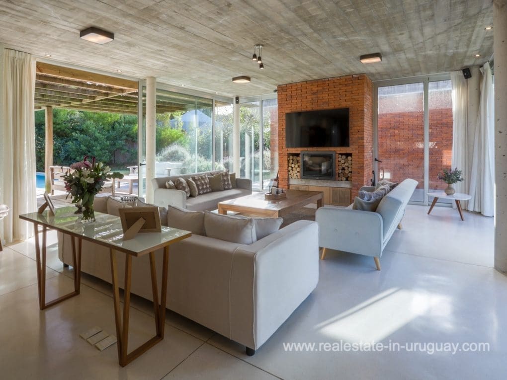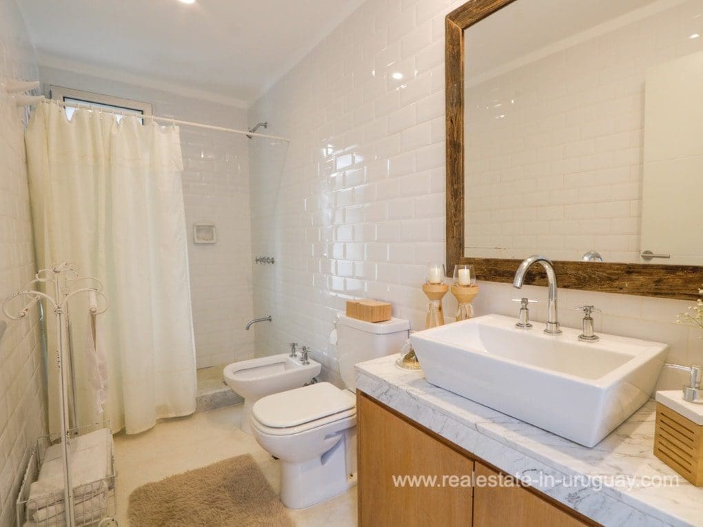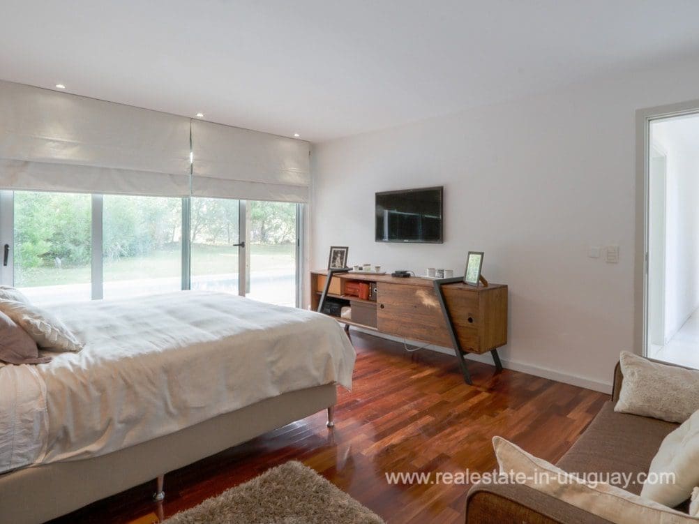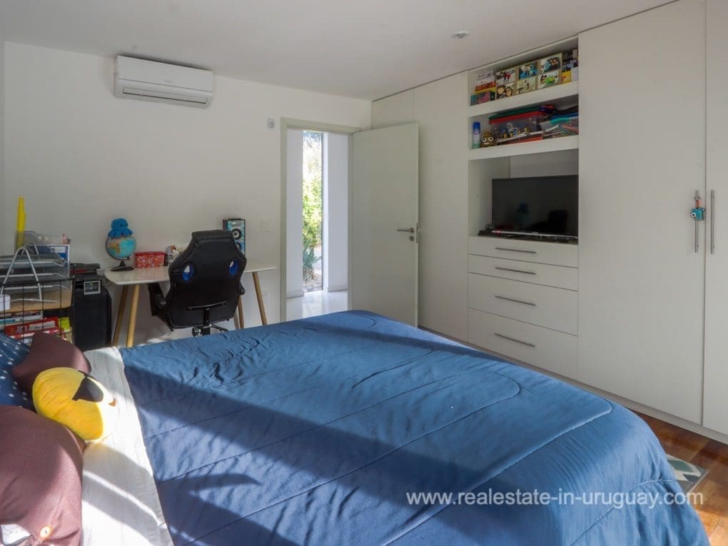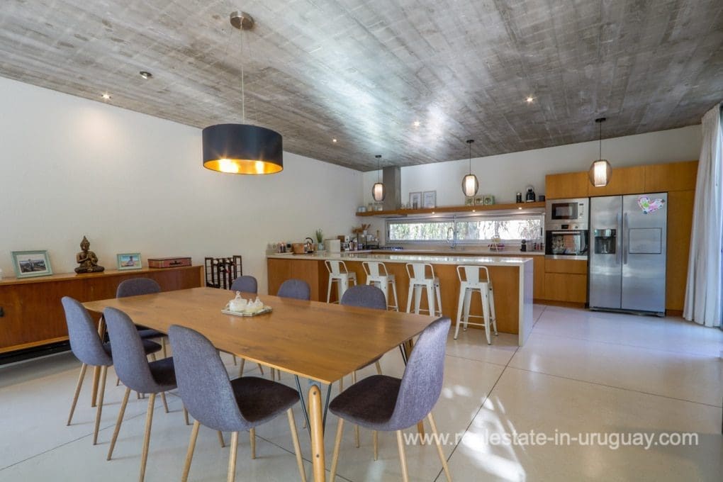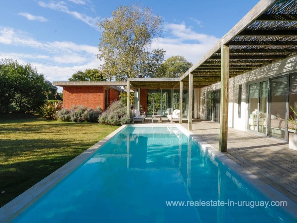 A modern residence in Beverly Hills, located in a residential neighborhood of Punta Del Este near the schools, with high-quality construction and spacious rooms. It is designed for living all year round, with underfloor electric heating and heat pump, and air conditioning in all rooms. There is a living/dining room with a high-performance heater and an integrated kitchen. There are also four bedrooms, three with en suite bathrooms. The shutters and windows are aluminum with double glazing. Outside, there is a spacious deck with a swimming pool and a guest bedroom and bathroom. There is also a large garden with a water well and sprinkler system.