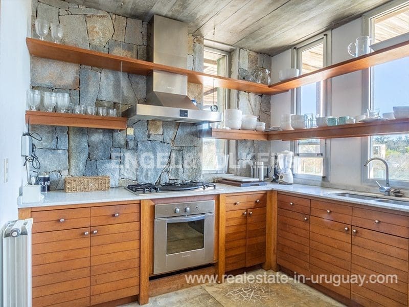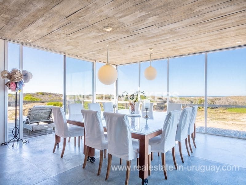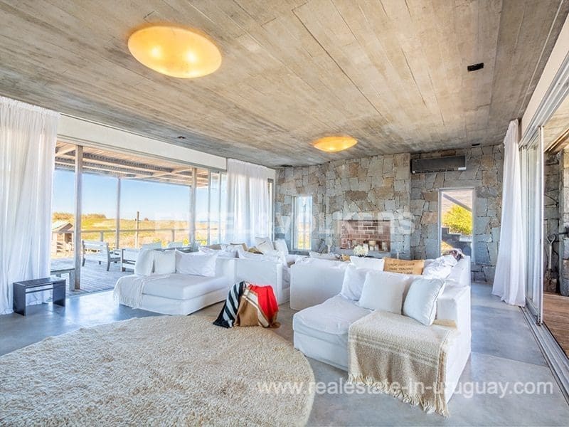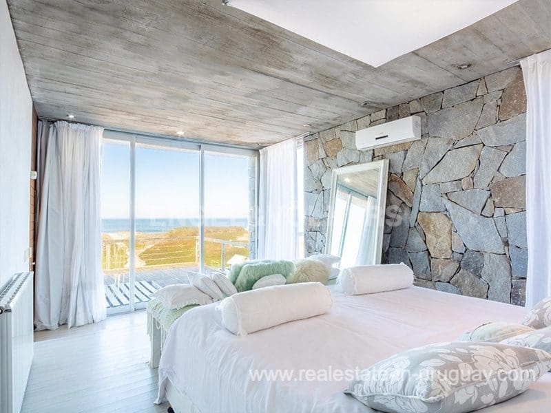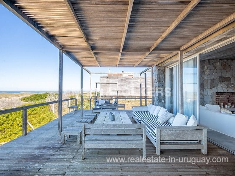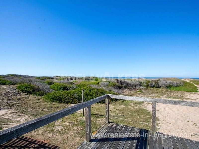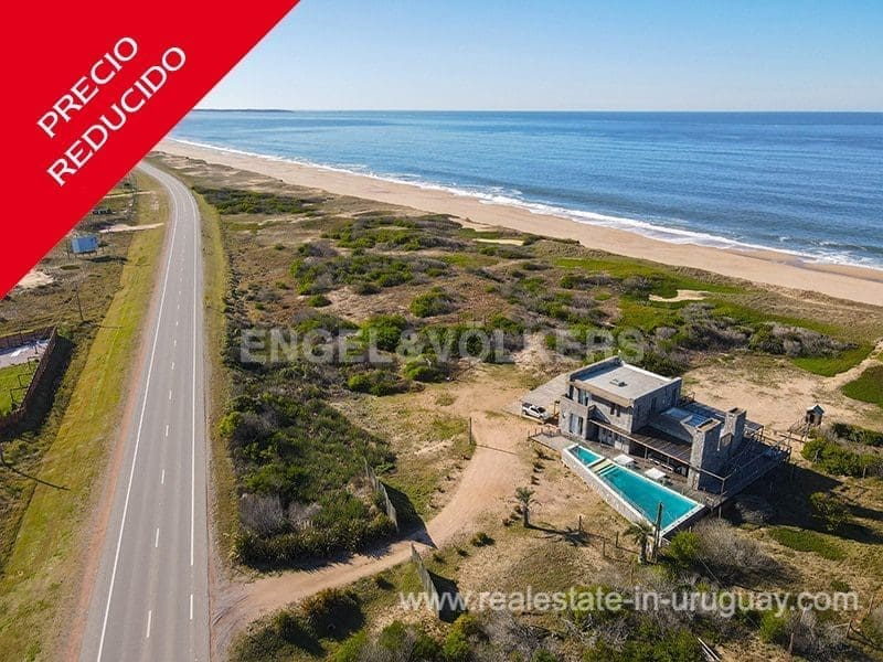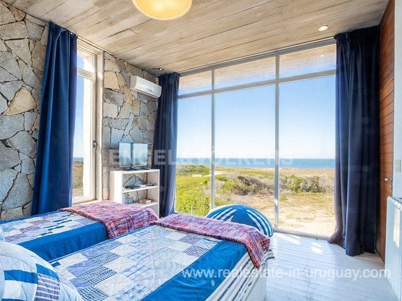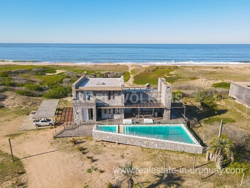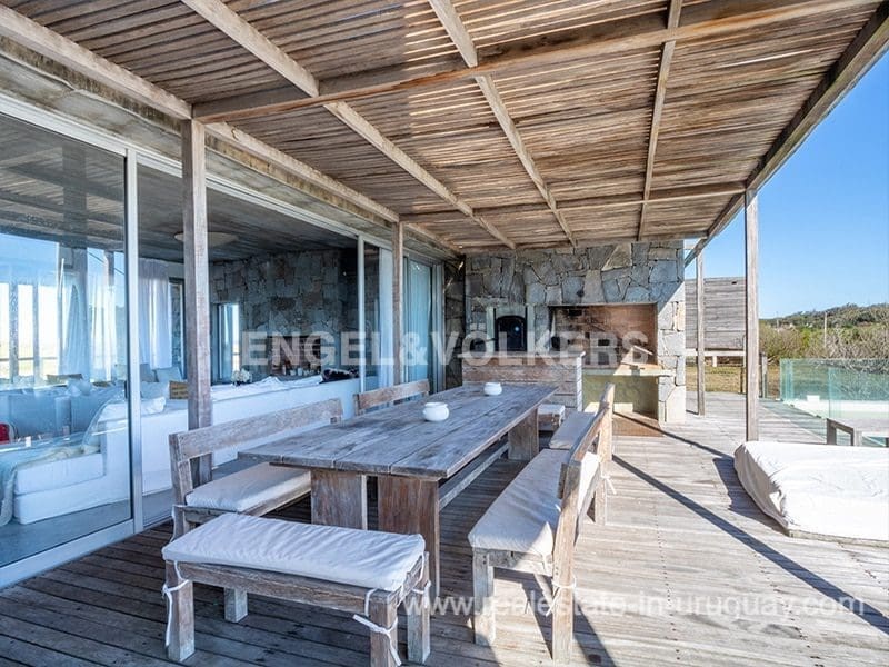 A beautiful property designed by the prestigious architect, Martin Gomez in Santa Monica. It is situated on an 815m2 lot with a large 345m2 house on the dunes opposite the sea, just five minutes from Jose Ignacio and one minute from the outstanding restaurant La Susana, Bahia Vik. With a privileged location and impressive views. A very comfortable and well-laid out three-story, modern-style house made of glass, concrete, stone, and wood with spacious rooms. Bright living room with large wood-burning fireplace and an impressive dining room with splendid views of the sands. Complete kitchen. Four bedrooms, two with en suite bathrooms, on the second floor. A further two bedrooms share a full bathroom. Wooden decks surround the house and enjoy direct beach access for enjoying unforgettable summers, entirely at one with nature on the ocean coast. The house has split air conditioning in all rooms, a wood-burning fireplace in the living room, and electric radiators on the second floor. At the entrance and at the front of the house on a large terrace, there is a BBQ/grill covered by a wooden pergola and a very pretty outdoor swimming pool. In the basement, there is a caretaker’s house, a staff bedroom with an independent bathroom, a utility room, and parking.