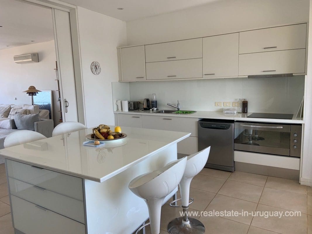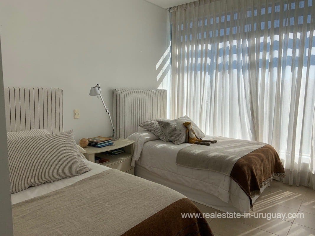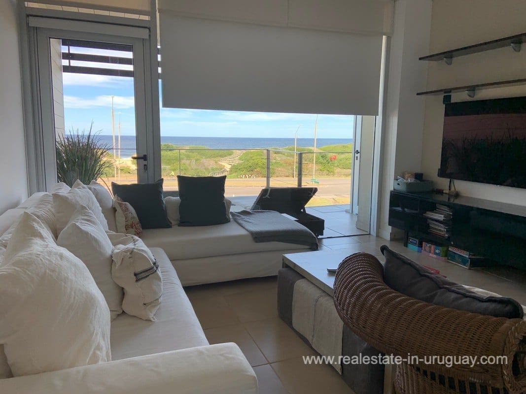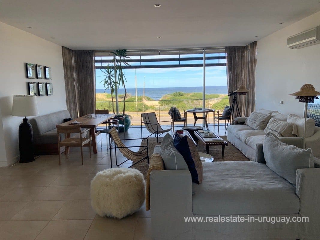 Espacio, a quality seafront apartment complex with a few apartments and exclusive amenities, is located in a unique spot between La Barra and Punta del Este. It features spacious and bright floors with high ceilings. This apartment includes three bedrooms with en suite bathrooms, a very spacious living room with an integrated designer dining room affording open views of the sea and beach, semi-integrated kitchen with island, front balcony affording sea views and back terrace with large fireplace/grill, full staff bedroom, and utility room. Really comfortable and well-decorated.
