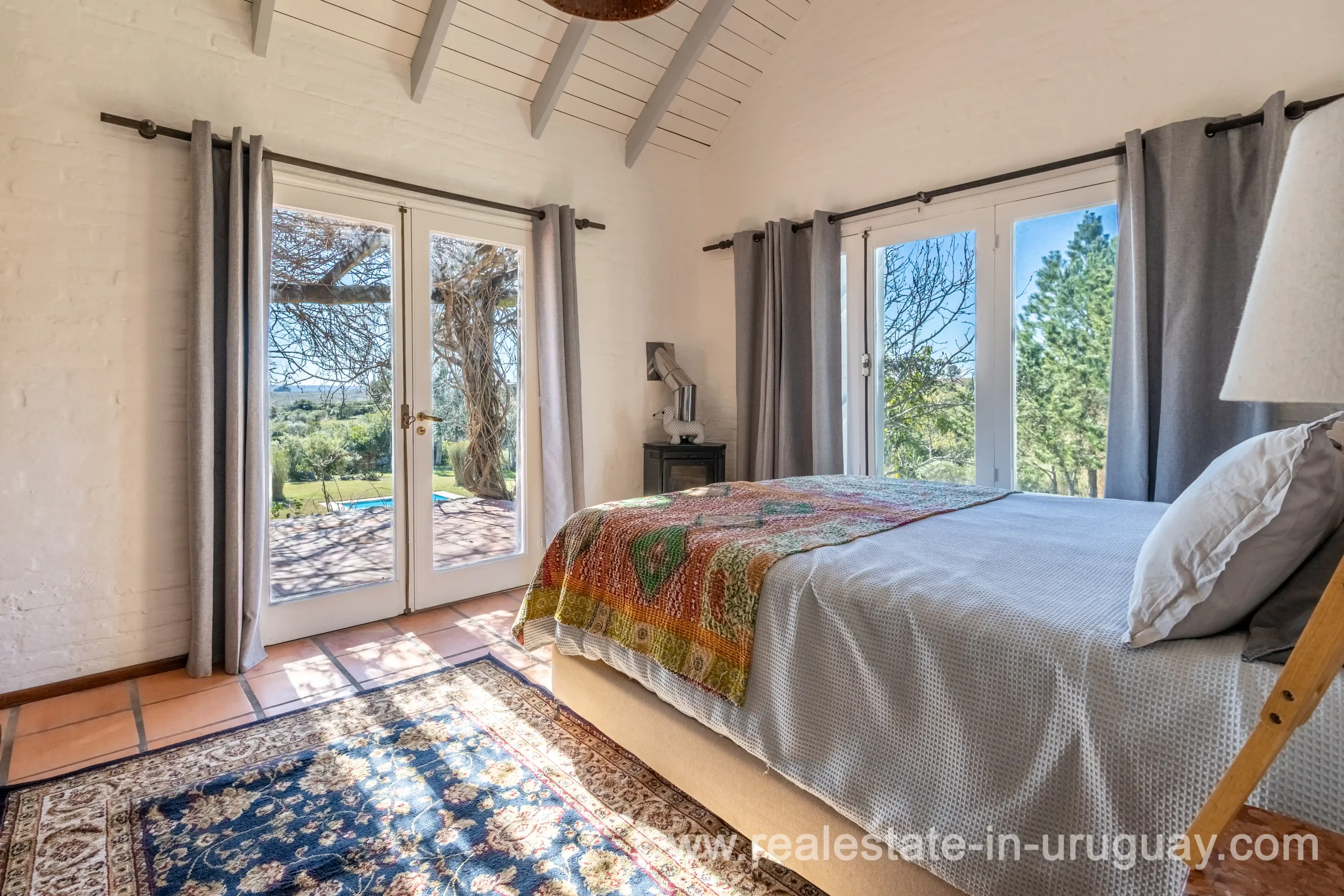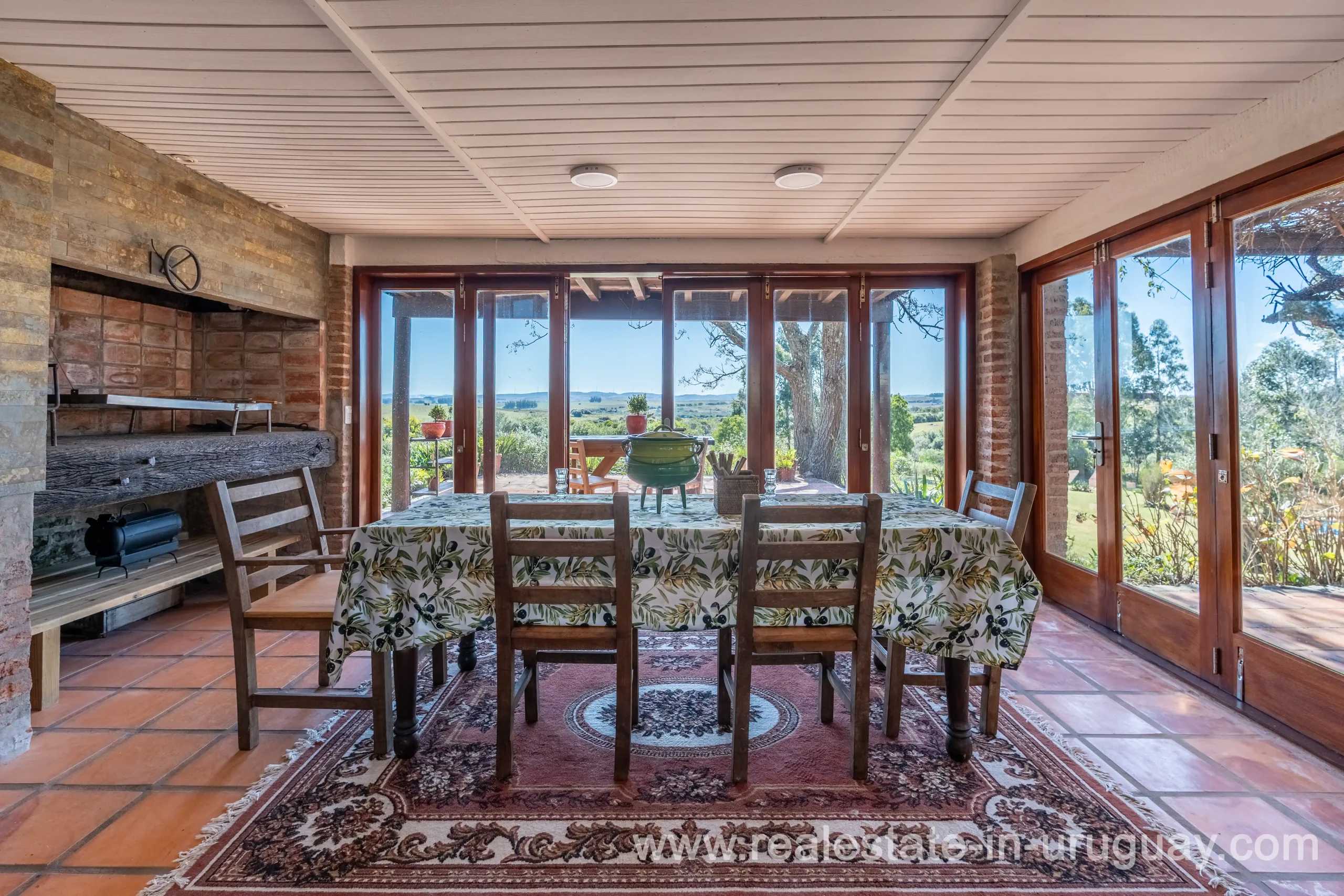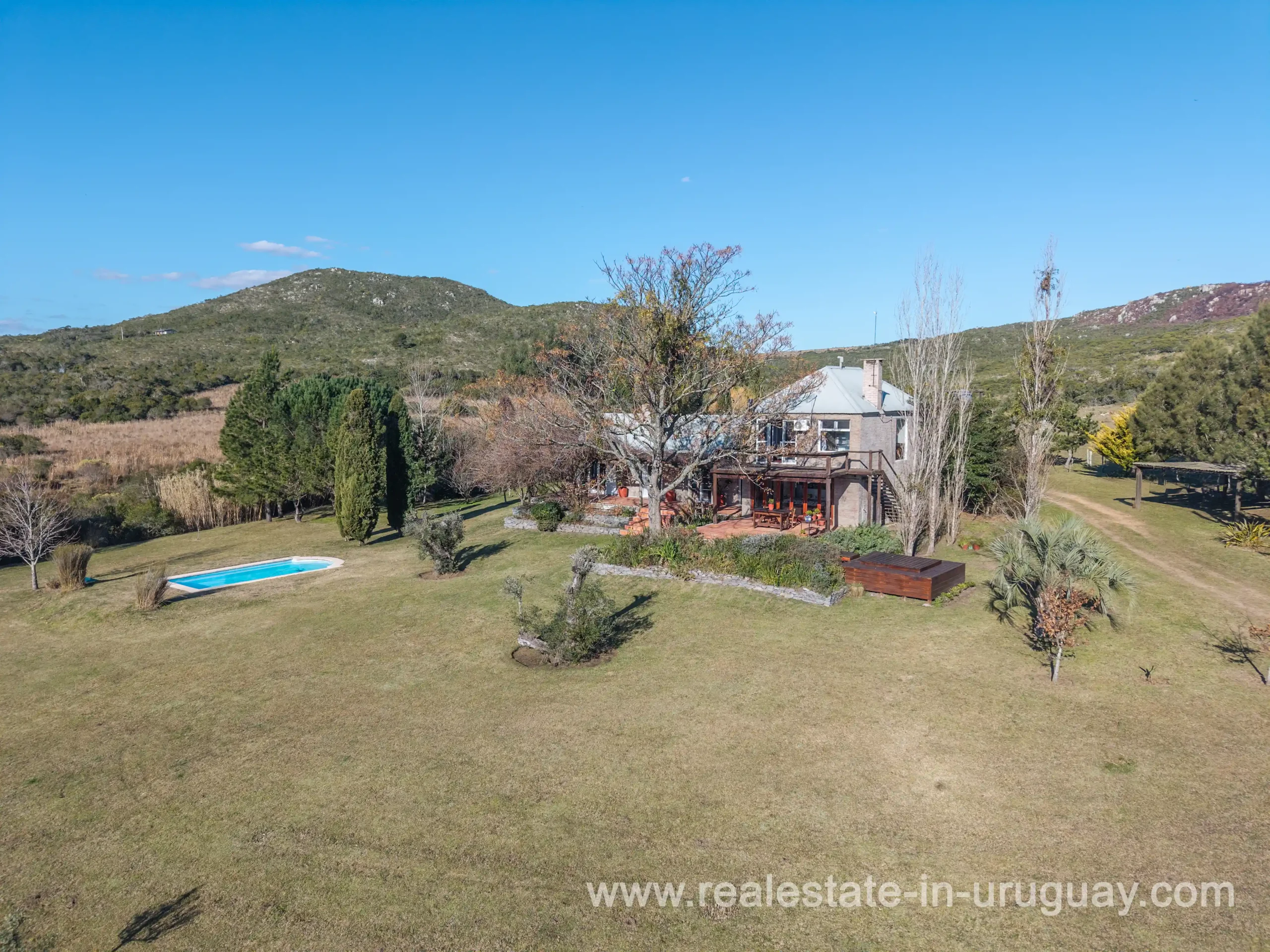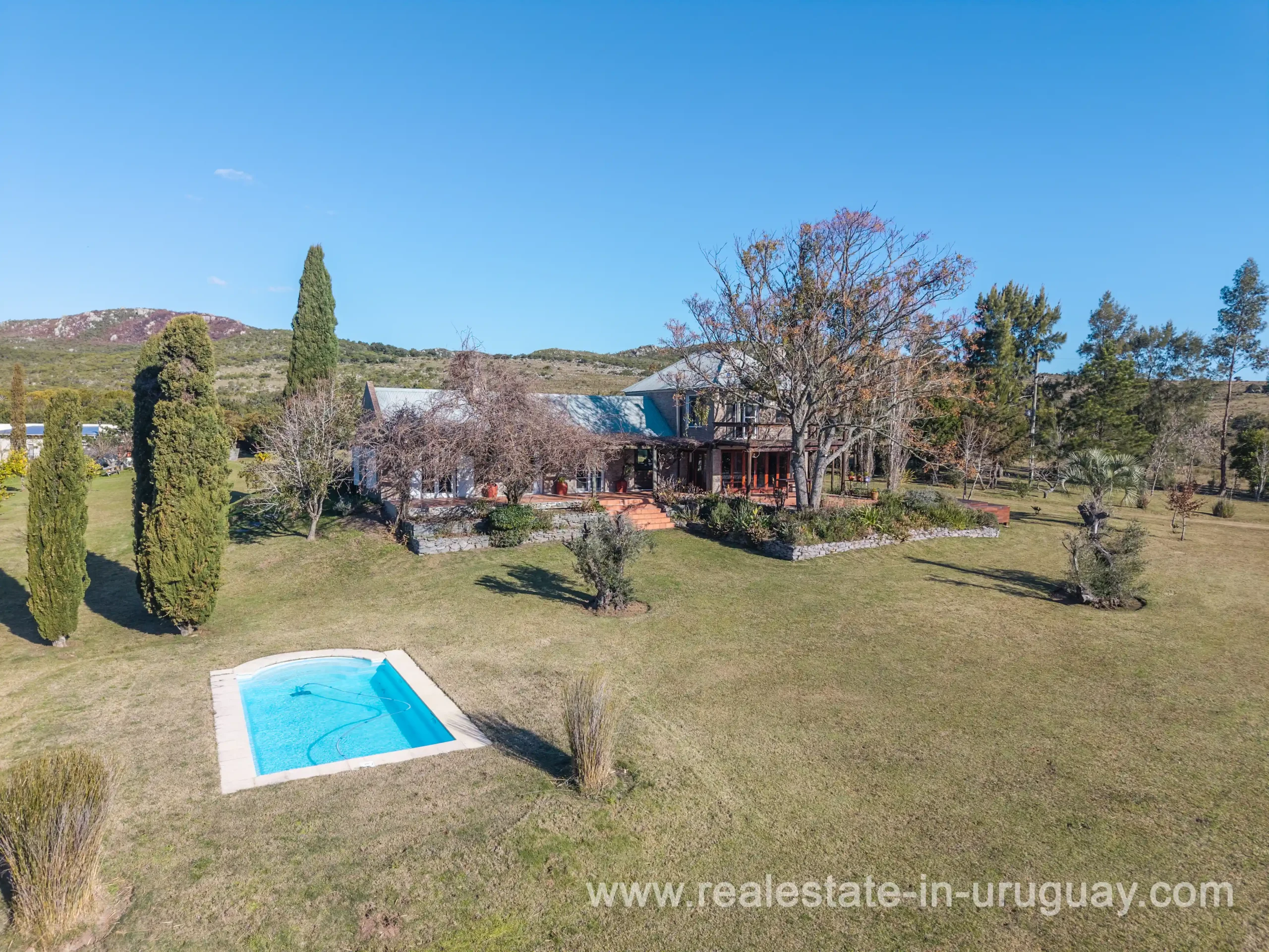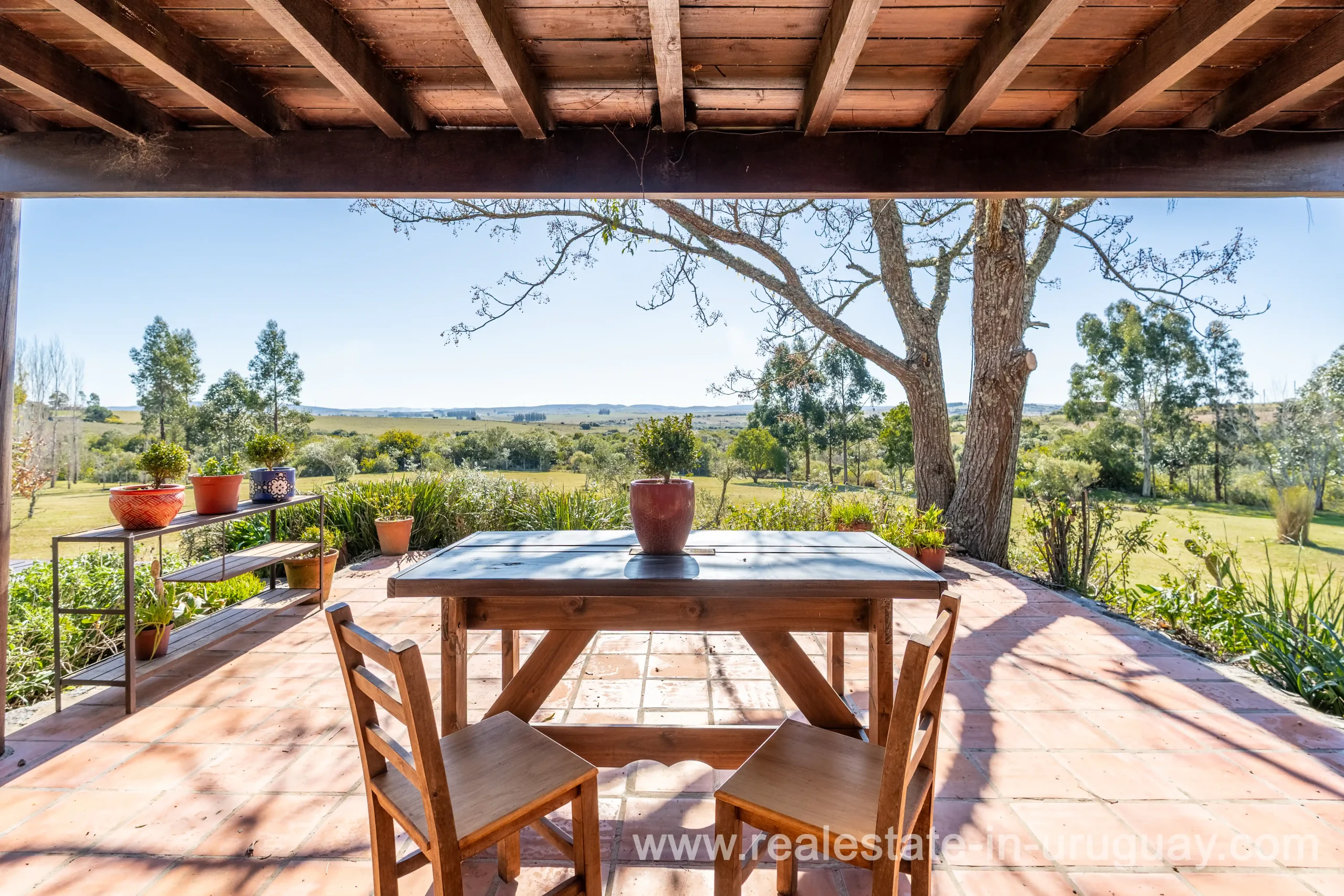 This attractive romantic ranch with beautiful views outside of Punta del Este is located on the outskirts of Maldonado just 20 minutes from San Carlos. It is situated in an elevated spot with beautiful natural surroundings. One part of the property is slightly on a hill and would be ideal for planting vine grapes or olive trees to grow. A small stream crossing the property and woodland create a tranquil environment. The 9 hectares plot contains a welcoming two-storey house. The ground floor comprises a living room with fireplace and swedish oven, dining room with open kitchen, large outside dining patio with covered BBQ, a good size guest bedroom and bathroom. On the first floor is an open studio, which could be used as an additional living area or office, and the master bedroom with en suite bathroom with its own terrace. All rooms have a swedisch oven for heating, are bright and enjoy panoramic views and access to the enticing outdoor areas. The grounds are beautiful with lots of plants and fruit trees and the energy on the property is something very special. There is a swimming pool with sun deck area and a large vegetable garden. A separate caretaker’s lodge with a garage is independent to the main property. There is enough room to build out and an ideal place to create a small retreat center. Viewing is highly recommended in order to fully appreciate the true beauty of this place and don’t miss the 3D Virtual Tour.