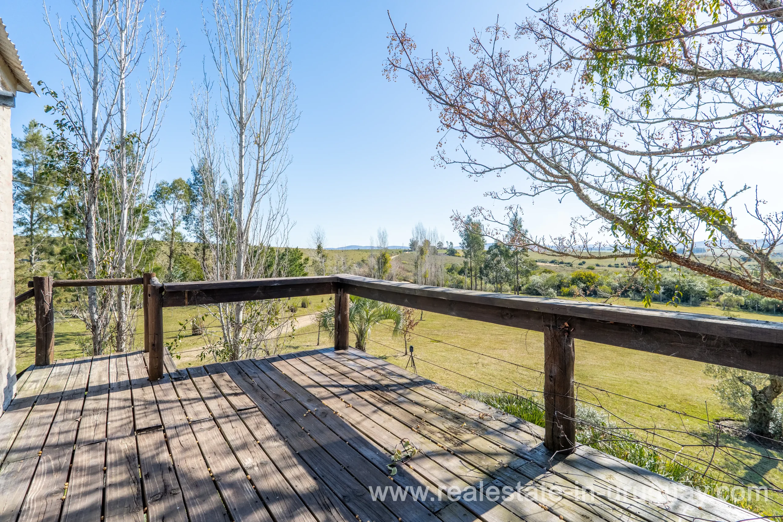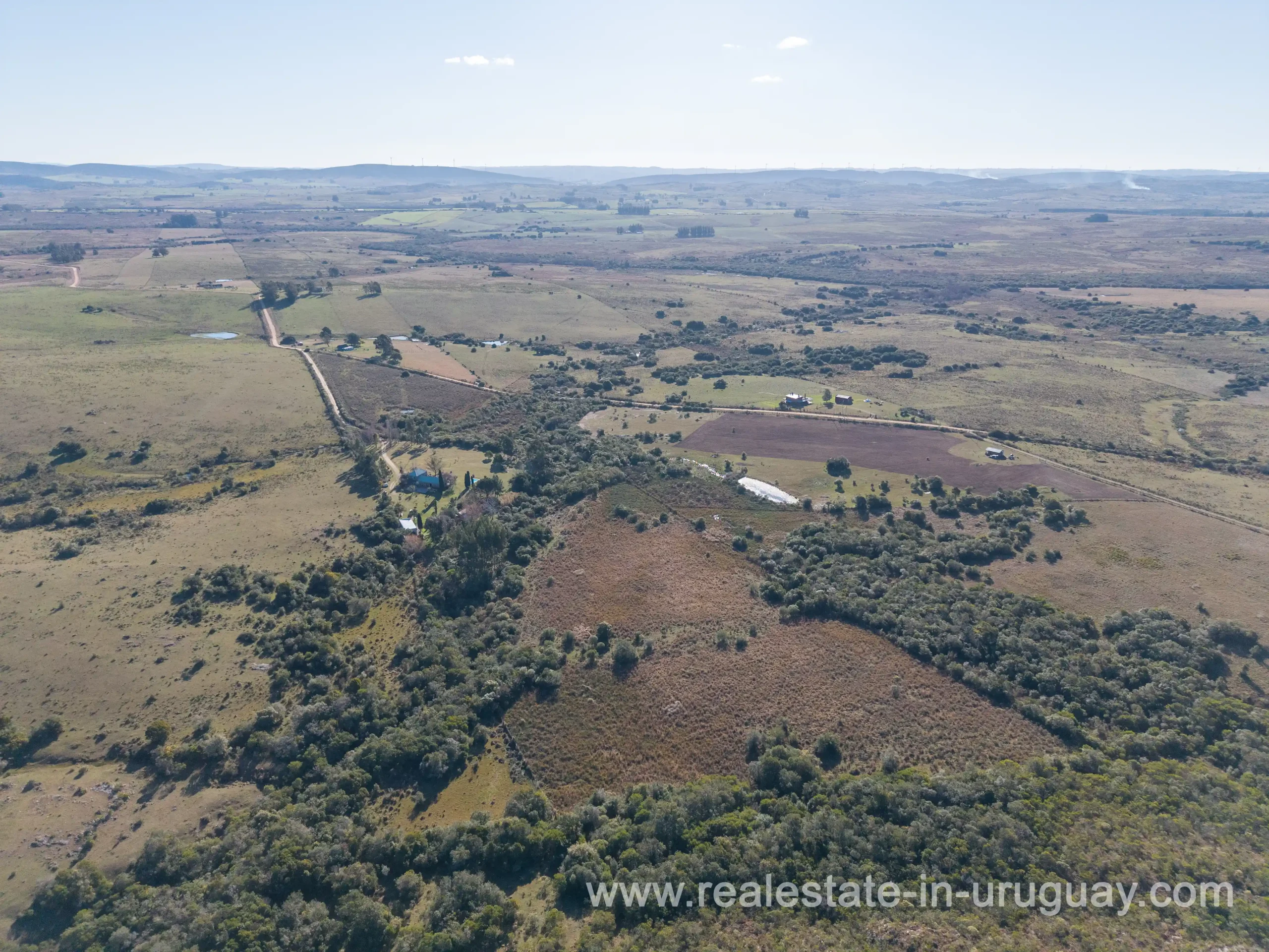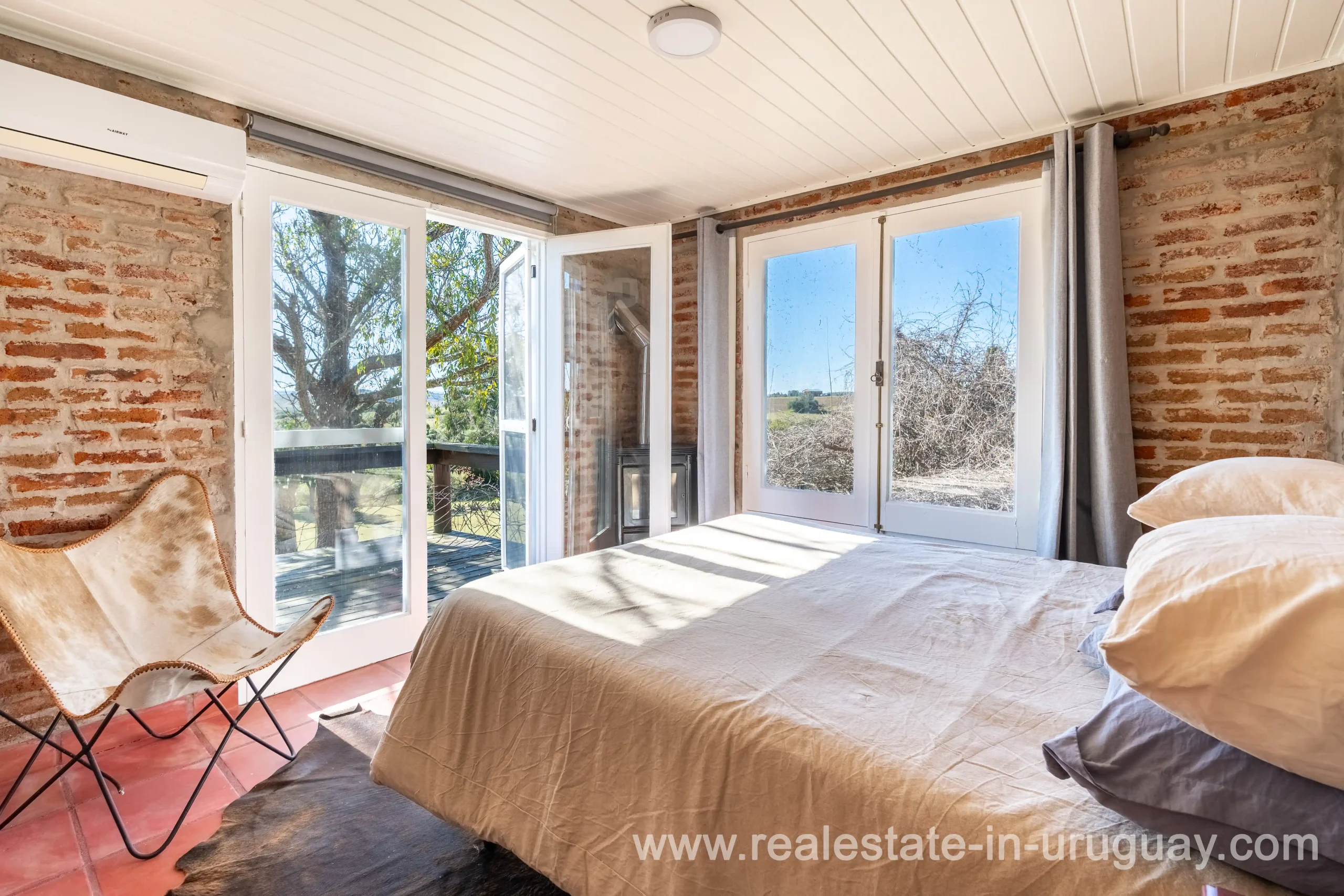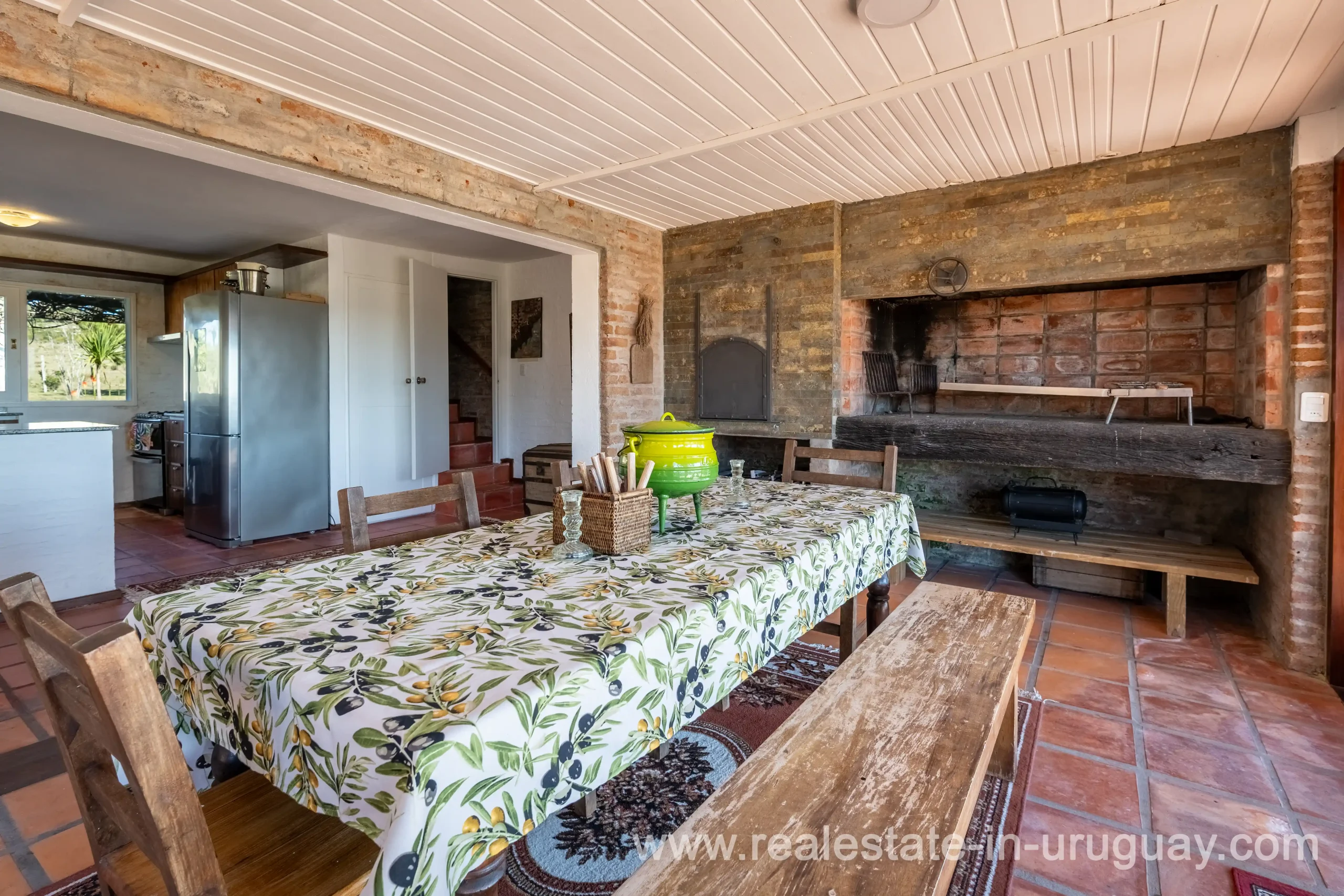 This attractive romantic ranch with beautiful views outside of Punta del Este is located on the outskirts of Maldonado just 20 minutes from San Carlos. It is situated in an elevated spot with beautiful natural surroundings. One part of the property is slightly on a hill and would be ideal for planting vine grapes or olive trees to grow. A small stream crossing the property and woodland create a tranquil environment. The 9 hectares plot contains a welcoming two-storey house. The ground floor comprises a living room with fireplace and swedish oven, dining room with open kitchen, large outside dining patio with covered BBQ, a good size guest bedroom and bathroom. On the first floor is an open studio, which could be used as an additional living area or office, and the master bedroom with en suite bathroom with its own terrace. All rooms have a swedisch oven for heating, are bright and enjoy panoramic views and access to the enticing outdoor areas. The grounds are beautiful with lots of plants and fruit trees and the energy on the property is something very special. There is a swimming pool with sun deck area and a large vegetable garden. A separate caretaker’s lodge with a garage is independent to the main property. There is enough room to build out and an ideal place to create a small retreat center. Viewing is highly recommended in order to fully appreciate the true beauty of this place and don’t miss the 3D Virtual Tour.