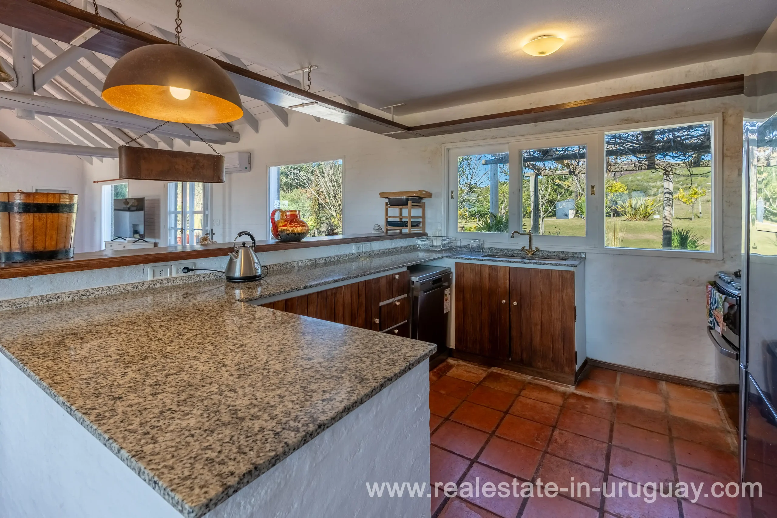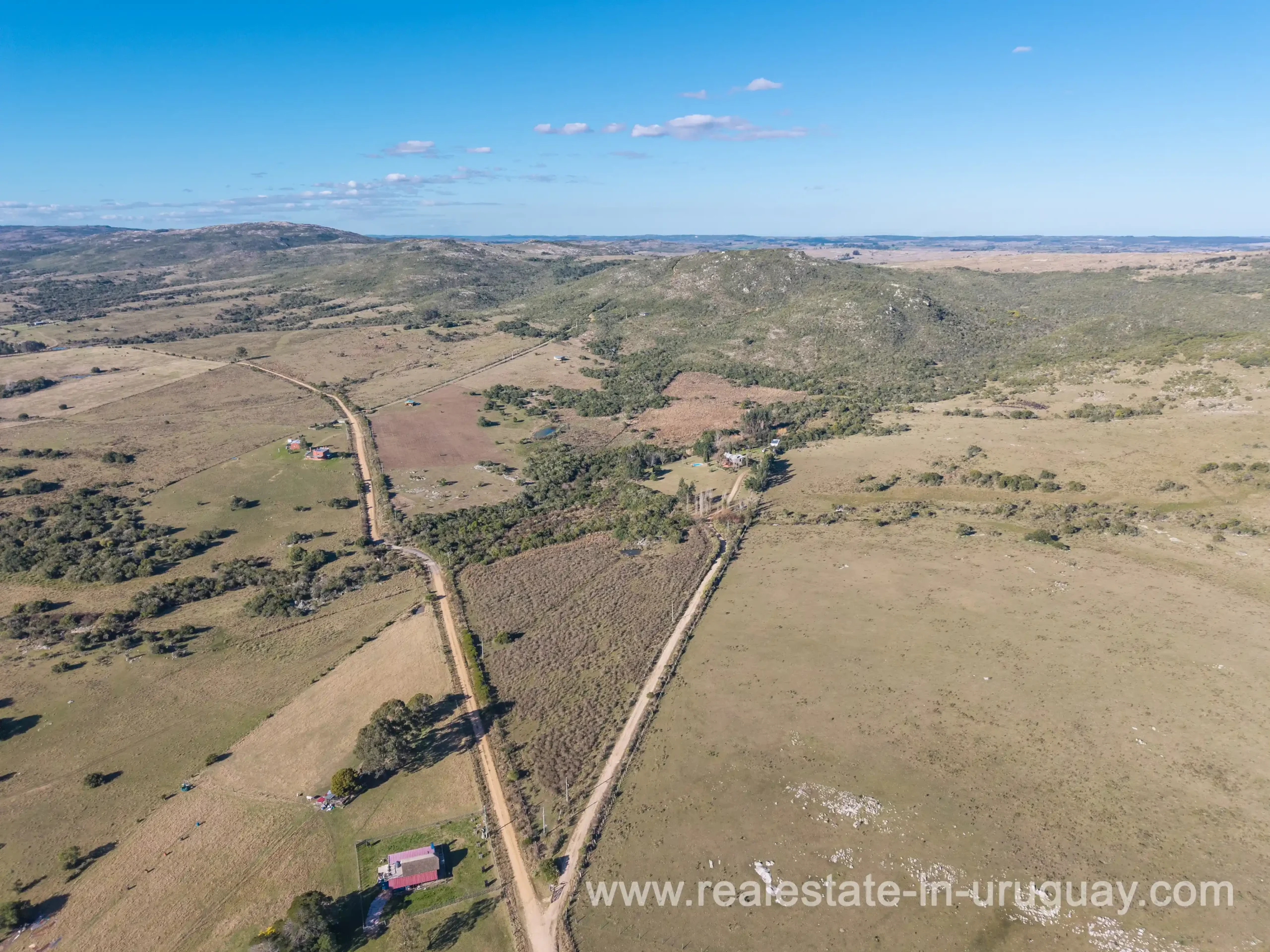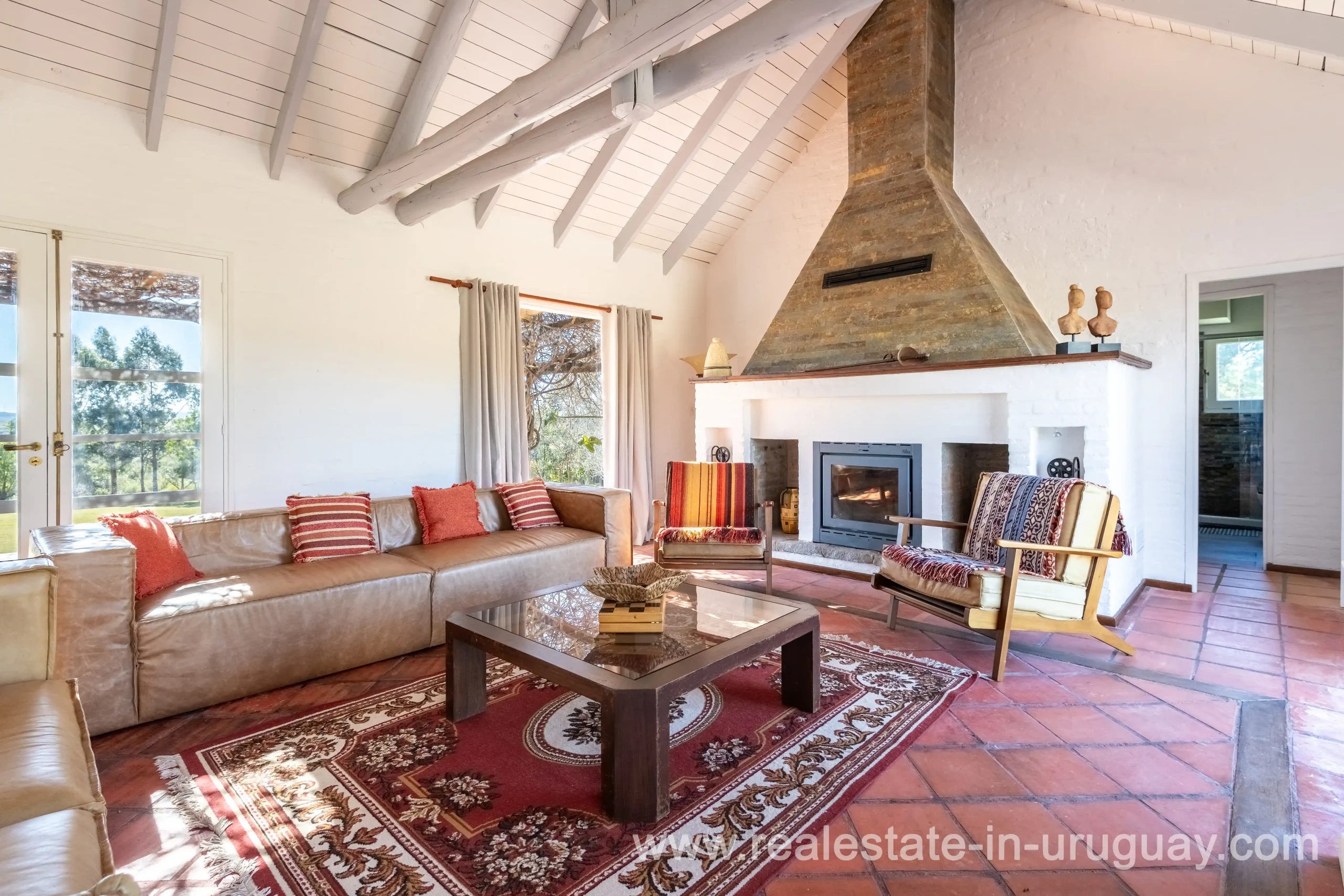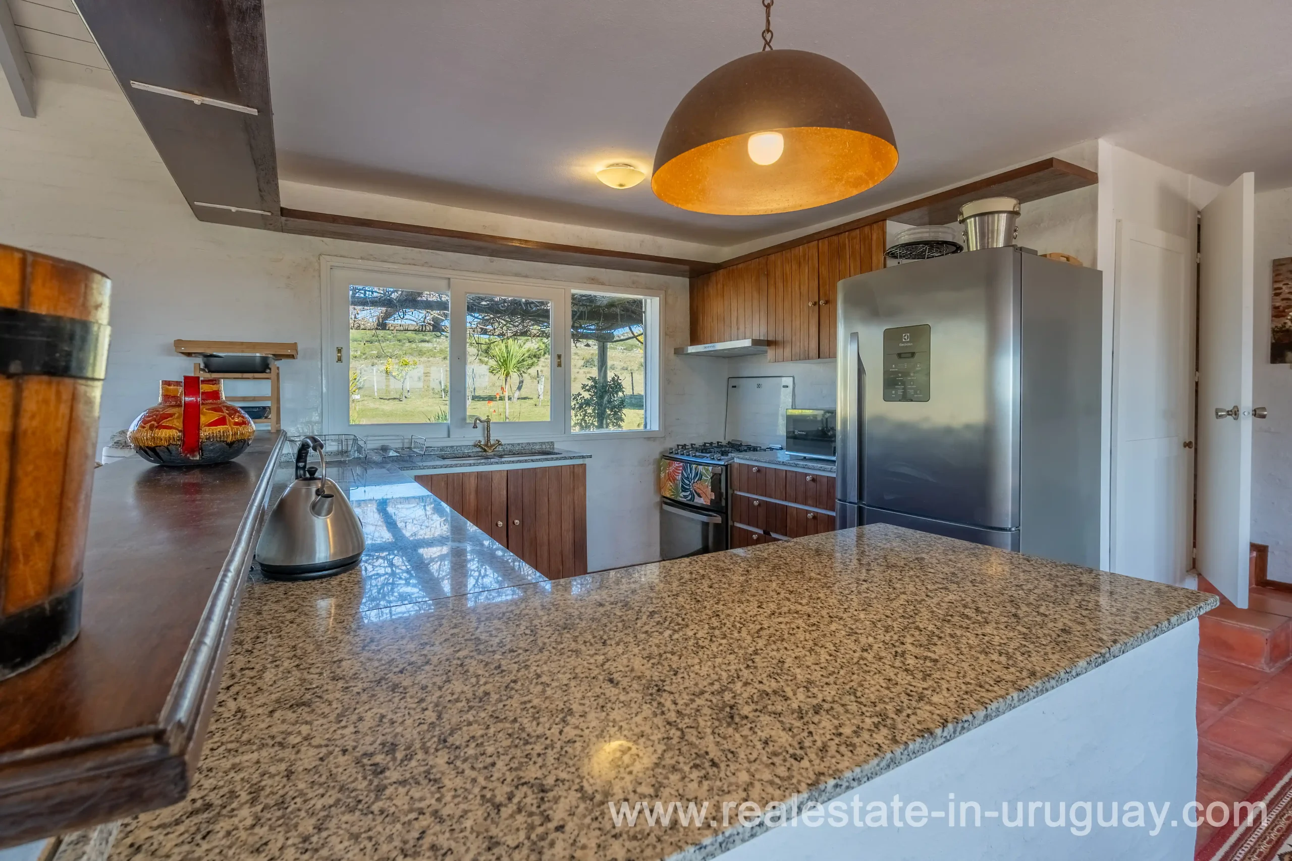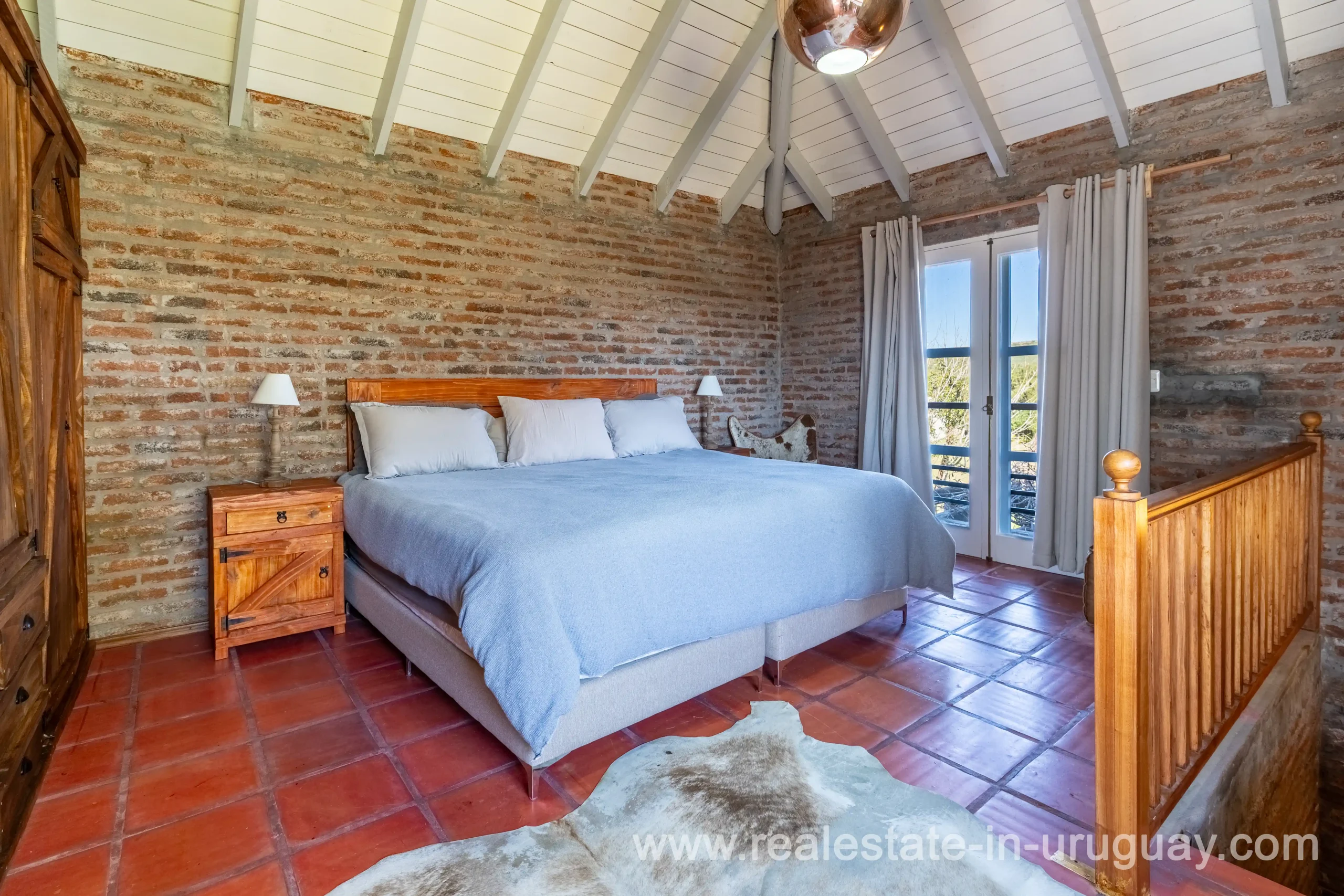 This attractive romantic ranch with beautiful views outside of Punta del Este is located on the outskirts of Maldonado just 20 minutes from San Carlos. It is situated in an elevated spot with beautiful natural surroundings. One part of the property is slightly on a hill and would be ideal for planting vine grapes or olive trees to grow. A small stream crossing the property and woodland create a tranquil environment. The 9 hectares plot contains a welcoming two-storey house. The ground floor comprises a living room with fireplace and swedish oven, dining room with open kitchen, large outside dining patio with covered BBQ, a good size guest bedroom and bathroom. On the first floor is an open studio, which could be used as an additional living area or office, and the master bedroom with en suite bathroom with its own terrace. All rooms have a swedisch oven for heating, are bright and enjoy panoramic views and access to the enticing outdoor areas. The grounds are beautiful with lots of plants and fruit trees and the energy on the property is something very special. There is a swimming pool with sun deck area and a large vegetable garden. A separate caretaker’s lodge with a garage is independent to the main property. There is enough room to build out and an ideal place to create a small retreat center. Viewing is highly recommended in order to fully appreciate the true beauty of this place and don’t miss the 3D Virtual Tour.