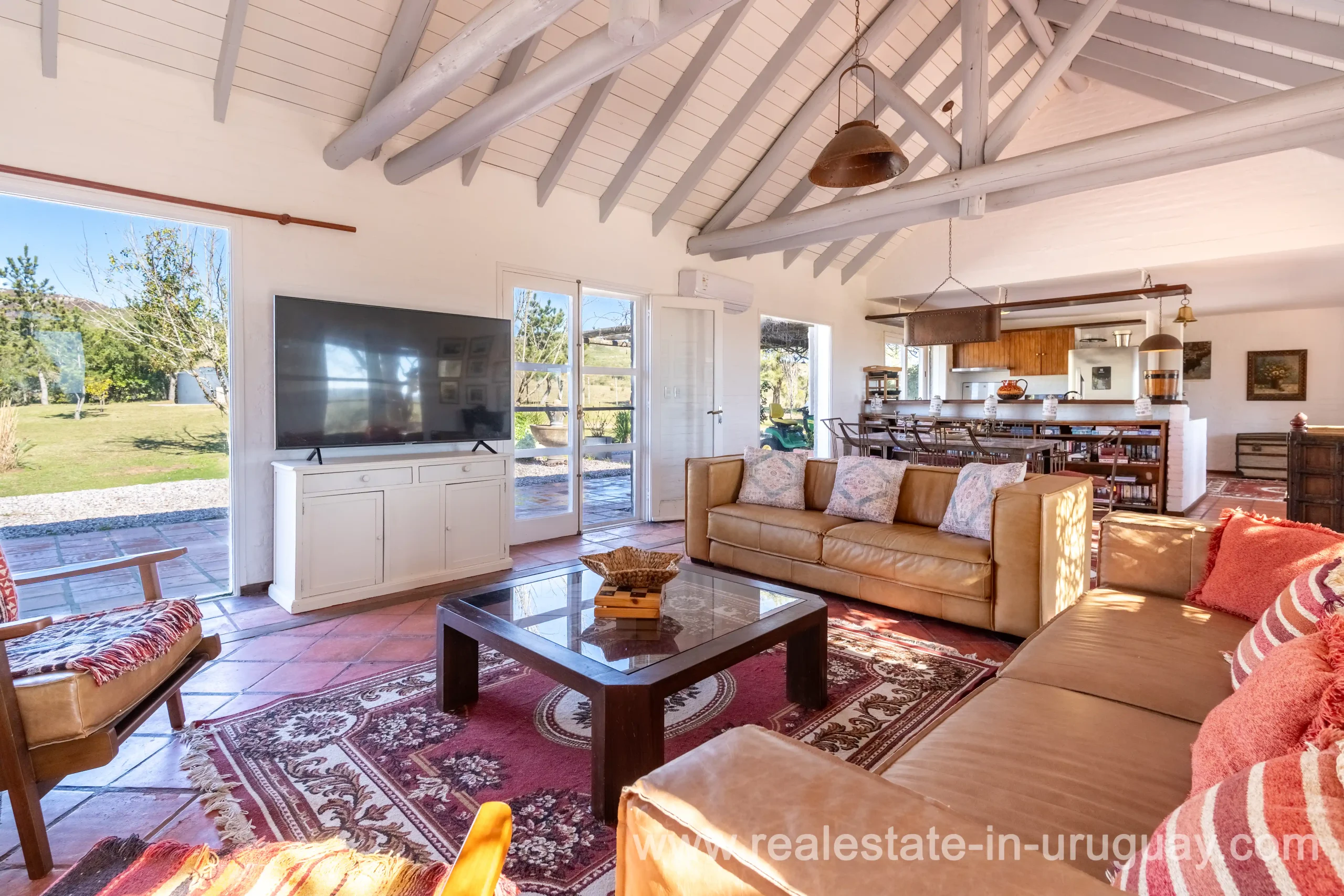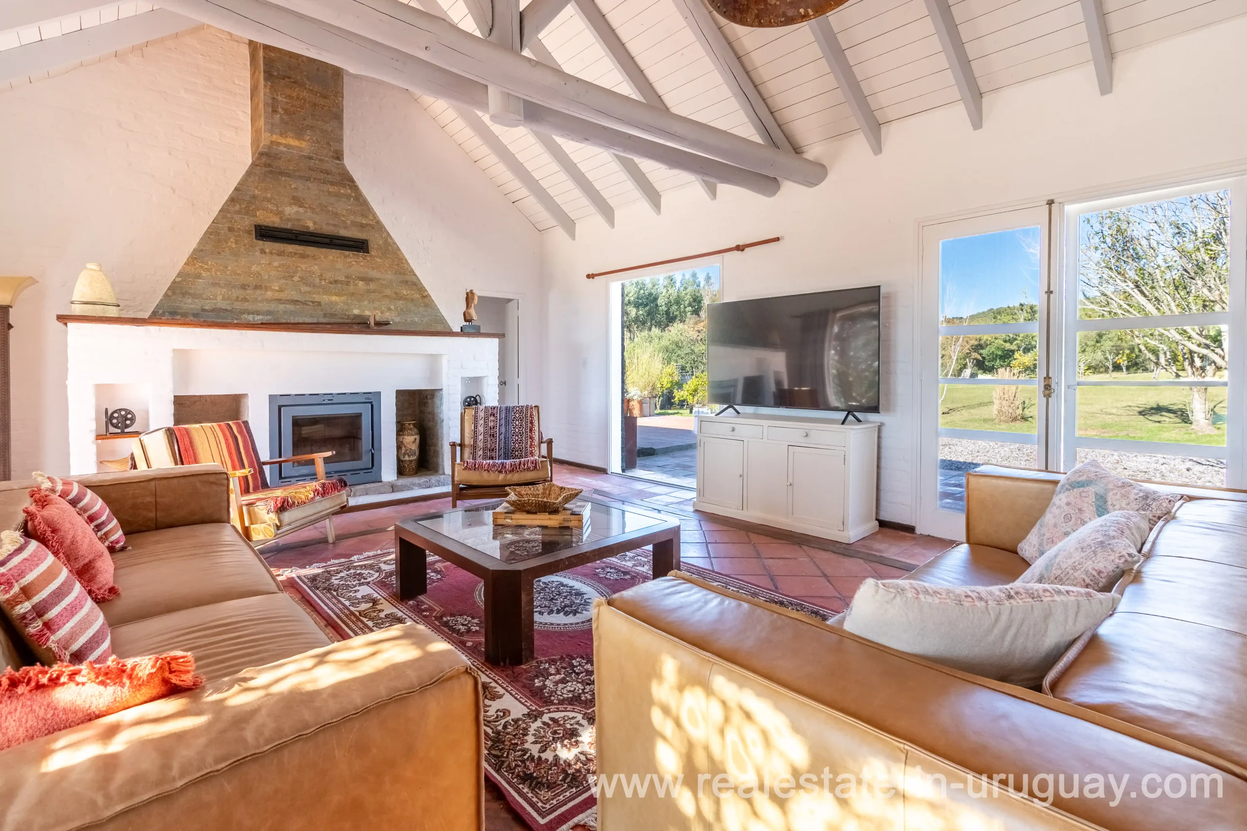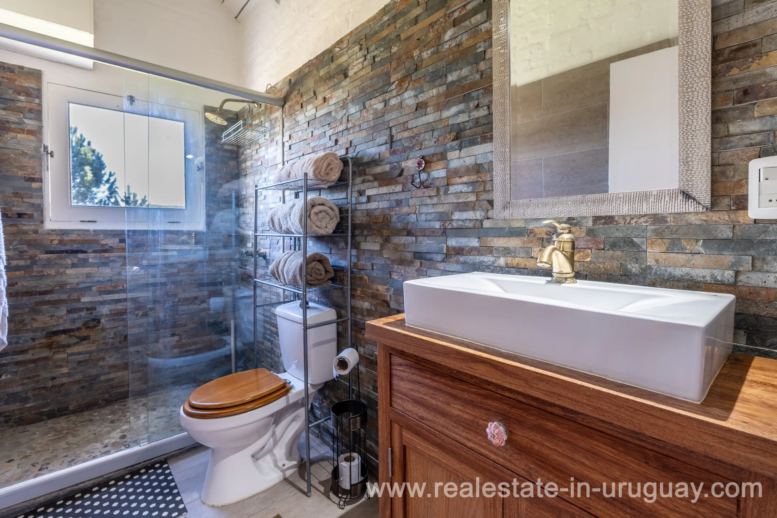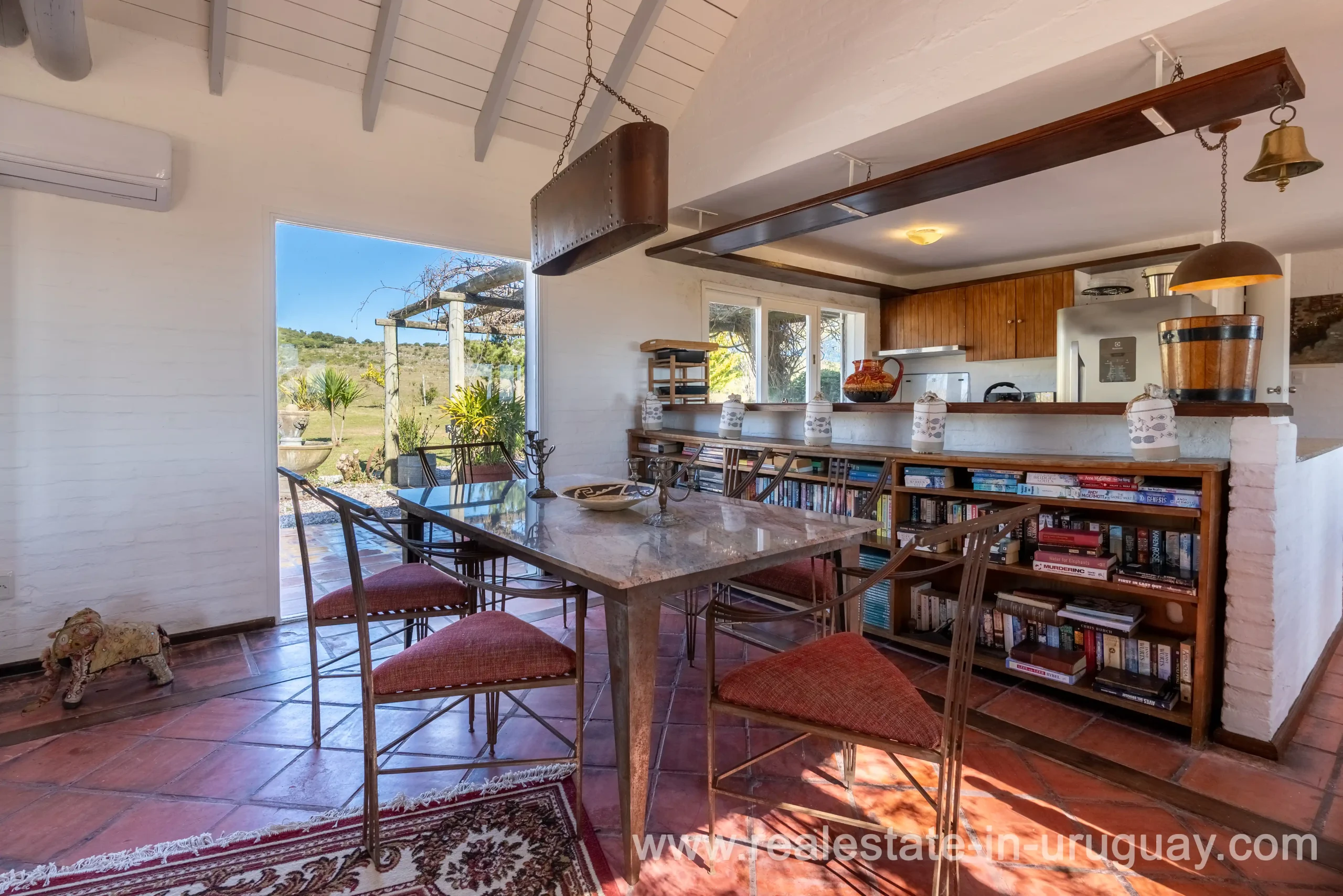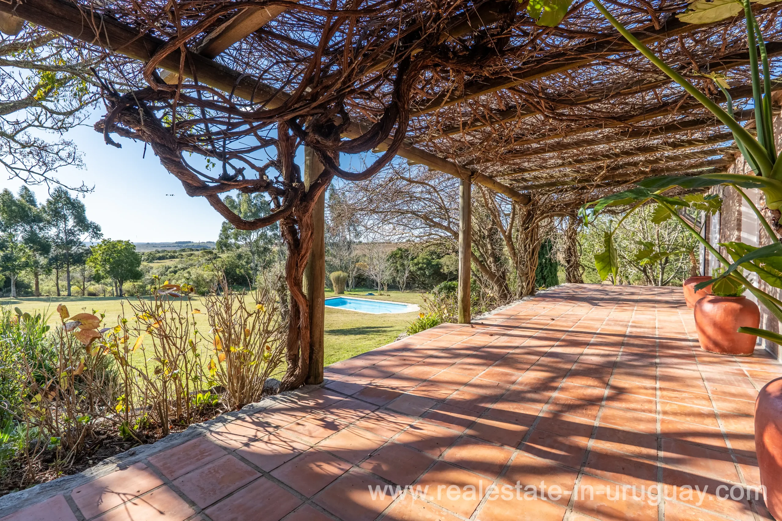This attractive romantic ranch with beautiful views outside of Punta del Este is located on the outskirts of Maldonado just 20 minutes from San Carlos. It is situated in an elevated spot with beautiful natural surroundings. One part of the property is slightly on a hill and would be ideal for planting vine grapes or olive trees to grow. A small stream crossing the property and woodland create a tranquil environment. The 9 hectares plot contains a welcoming two-storey house. The ground floor comprises a living room with fireplace and swedish oven, dining room with open kitchen, large outside dining patio with covered BBQ, a good size guest bedroom and bathroom. On the first floor is an open studio, which could be used as an additional living area or office, and the master bedroom with en suite bathroom with its own terrace. All rooms have a swedisch oven for heating, are bright and enjoy panoramic views and access to the enticing outdoor areas. The grounds are beautiful with lots of plants and fruit trees and the energy on the property is something very special. There is a swimming pool with sun deck area and a large vegetable garden. A separate caretaker’s lodge with a garage is independent to the main property. There is enough room to build out and an ideal place to create a small retreat center. Viewing is highly recommended in order to fully appreciate the true beauty of this place and don’t miss the 3D Virtual Tour.