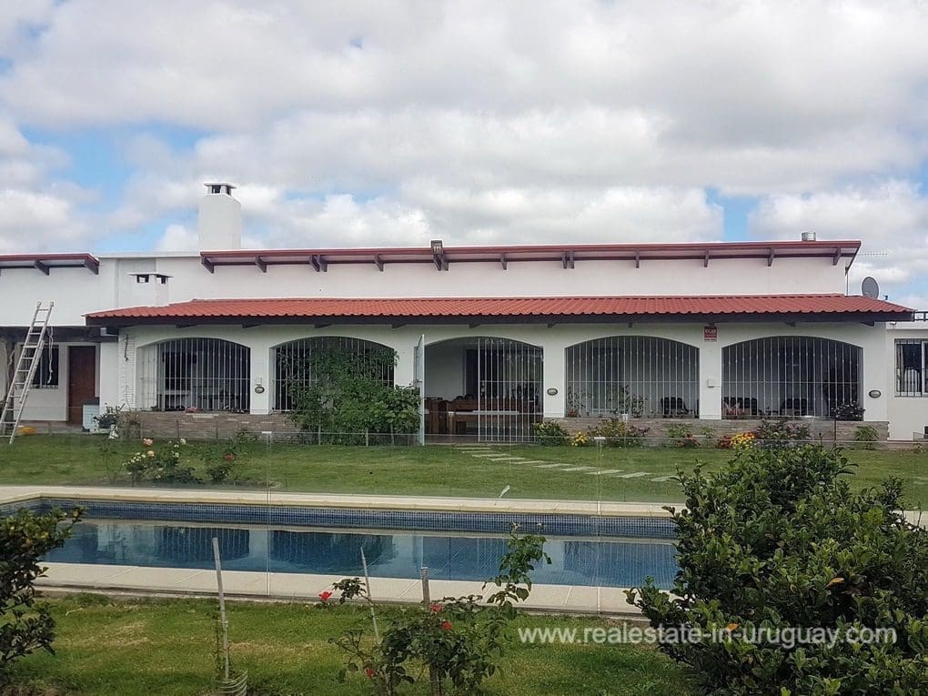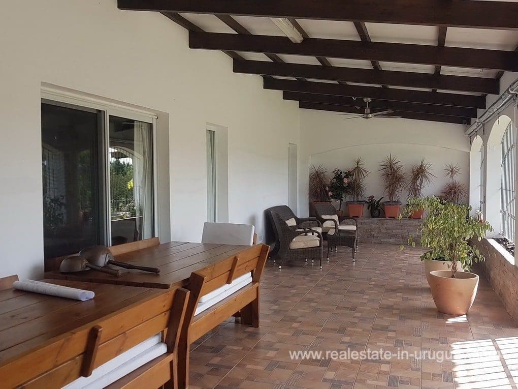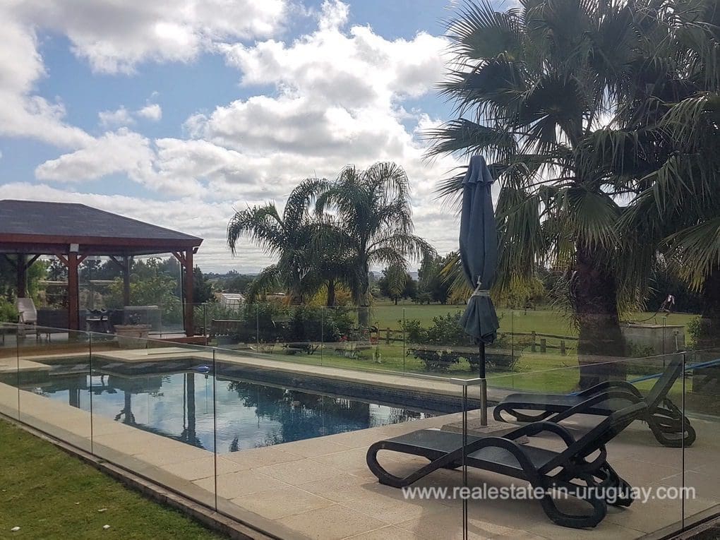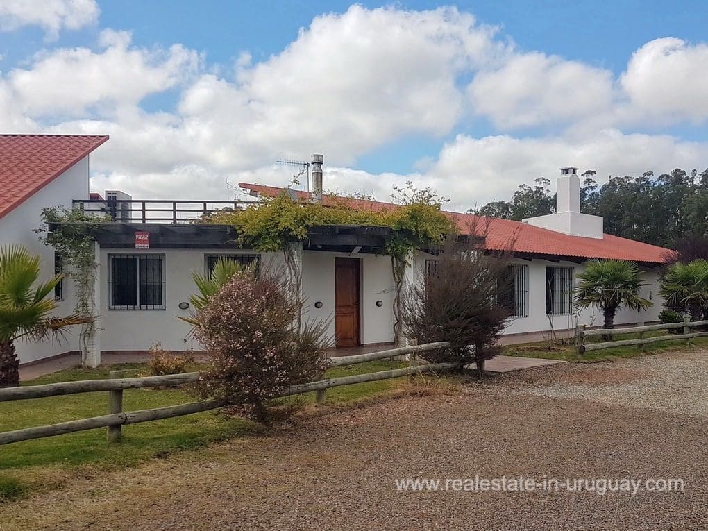 A Finca in Pueblo Eden, located approximately 45 km from Punta del Este in a compound with 16 Fincas. It comprises a very good quality 300m2 main house for living in all year round with four bedrooms; three of which have en suite bathrooms, WC, gymnasium, spacious kitchen, living room with high-performance wood-burning fireplace, swimming pool, large deck with covered BBQ/grill and air conditioning in all rooms. The property also has a utility room and a shed with a double garage. It is situated on a 5-hectare plot with fruit trees, a vegetable garden, a chicken coop, and more than 20 varieties of trees. It features exceptional panoramic views from all rooms, and has good access, electricity, internet, and well water.