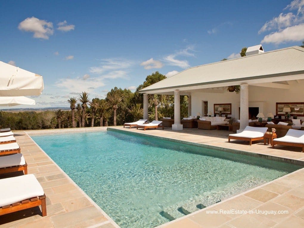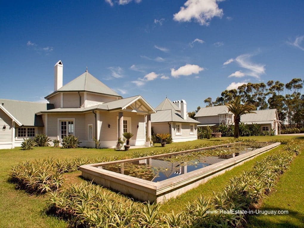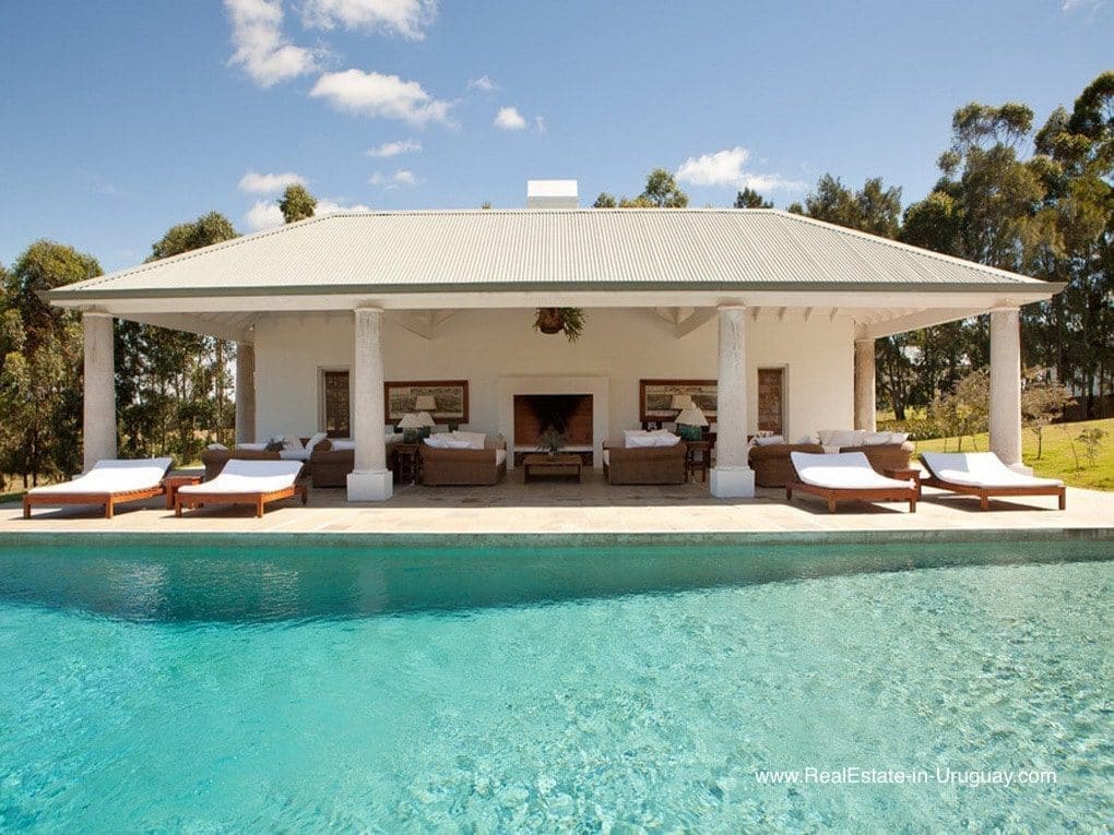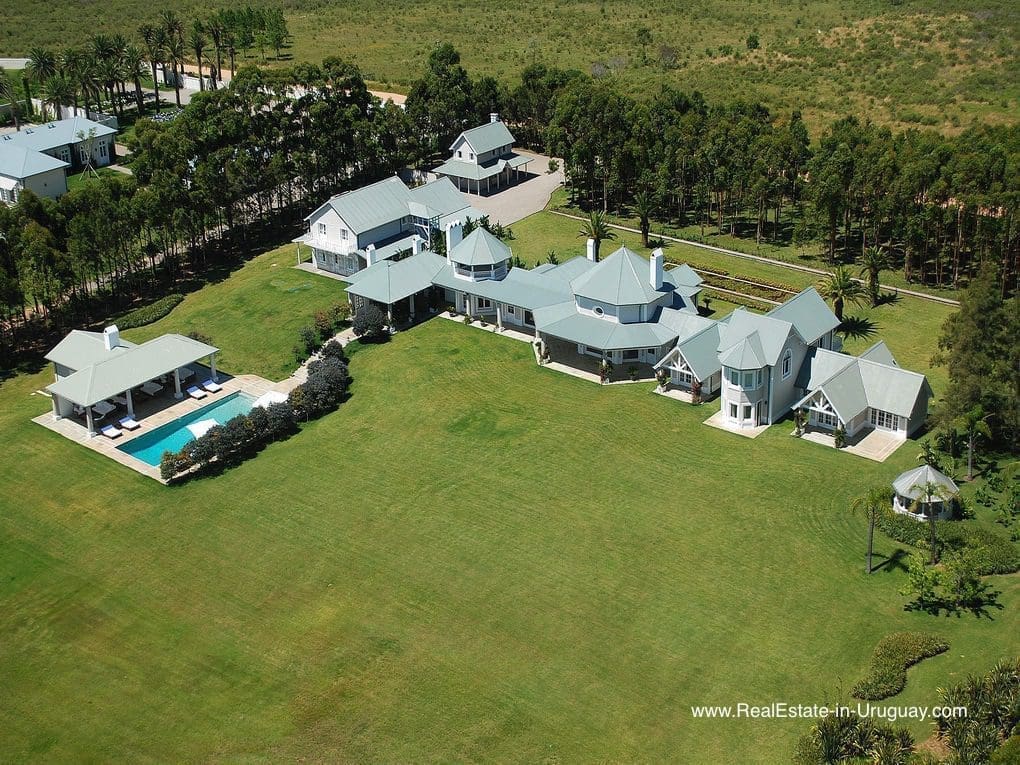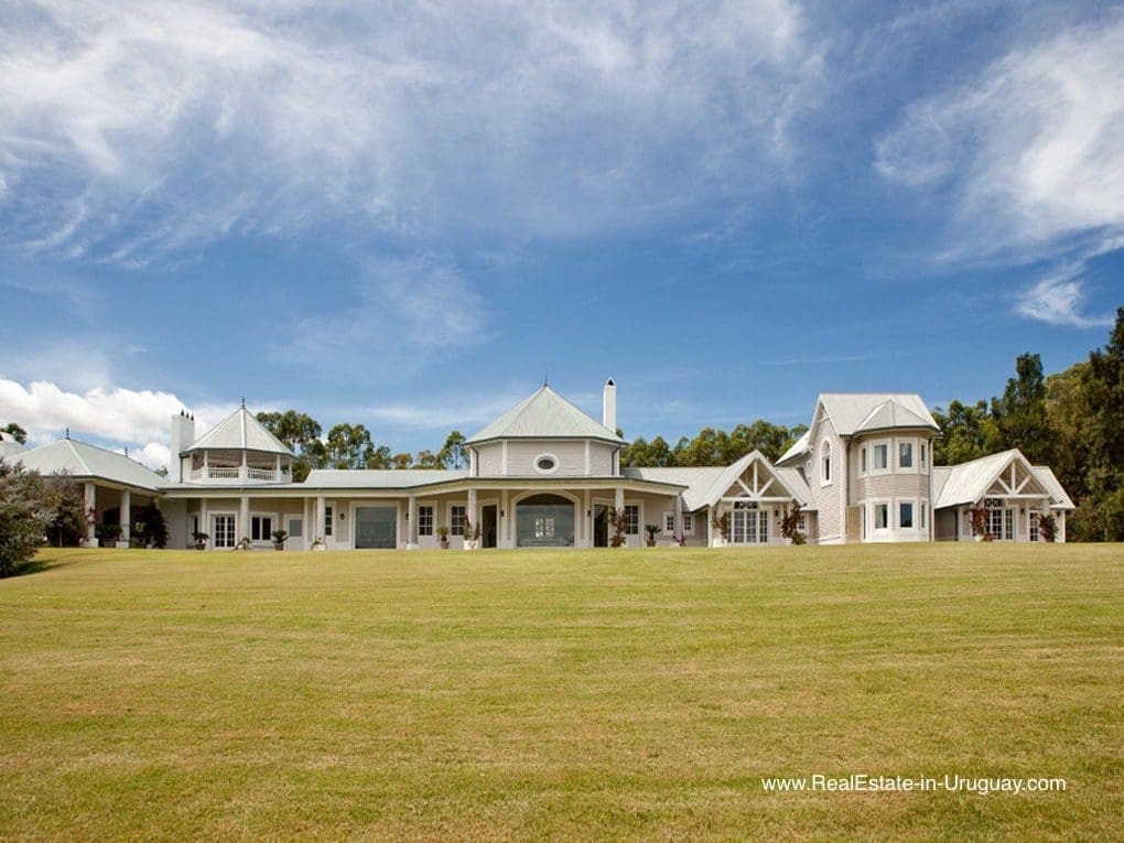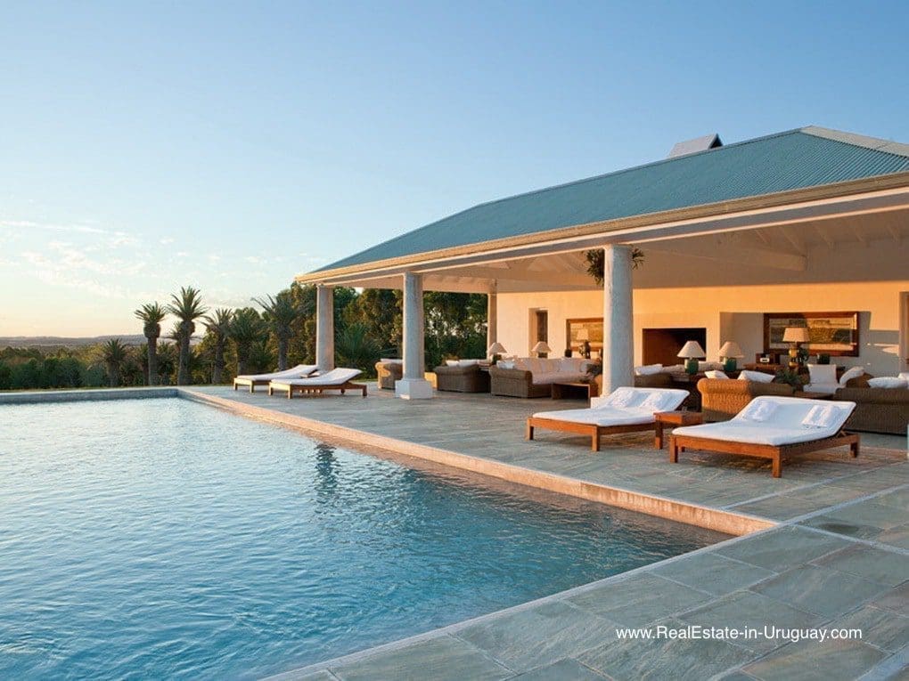 This unique country style ranch by Golf Course La Barra is located in the most prestigious area of touristic fincas in Punta del Este and just five minutes away from La Barra. This spectacular residence of more than 1,000m2 on a five-hectare plot is harmoniously integrated into its rural surroundings and the varied elevation of the land offers stunning sunset views. The entire grounds are landscaped with attention to detail to blend in with the natural topography of the land, which includes two reservoirs and a large pond at the main entrance. The house comprises spacious rooms and consists of a main hall with guest bathroom and coat rack, large living room, spacious dining room with direct access to the kitchen through a large room with wine cellar, private second living room, large covered BBQ and extensive covered deck serving as a pathway between the outside garden, the main living room, dining room and private living room. The first floor consists of a rectangular covered viewpoint with fireplace. The south wing comprises a second entrance hall with stairway to the top floor, four suites with exterior terraces, study and gazebo in the garden. The top floor consists of spacious master suite with dressing room and study with balcony. There is also a large 17x7m large swimming pool with spacious perimeter terrace, large covered pool house with heating and changing rooms for men and ladies plus a steam room. The property also comprises two exterior guest suites, staff house with living room, kitchen/dining room, two bathrooms and three bedrooms, garage, utility room and complete caretaker’s lodge. This is without doubt a unique and exclusive property, ideal for those seeking the peace and quiet of the countryside just a few minutes from Punta del Este, La Barra and José Ignacio.