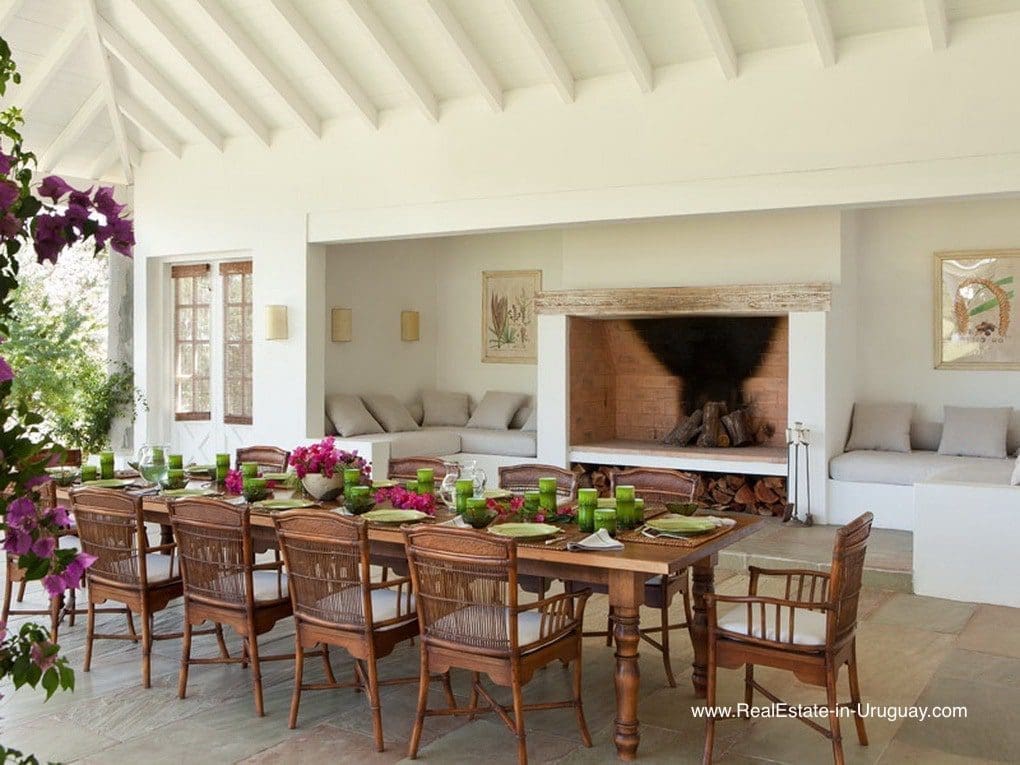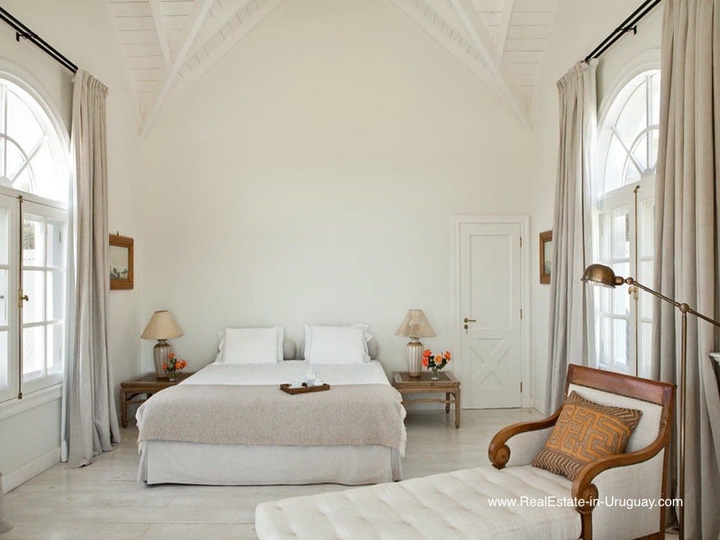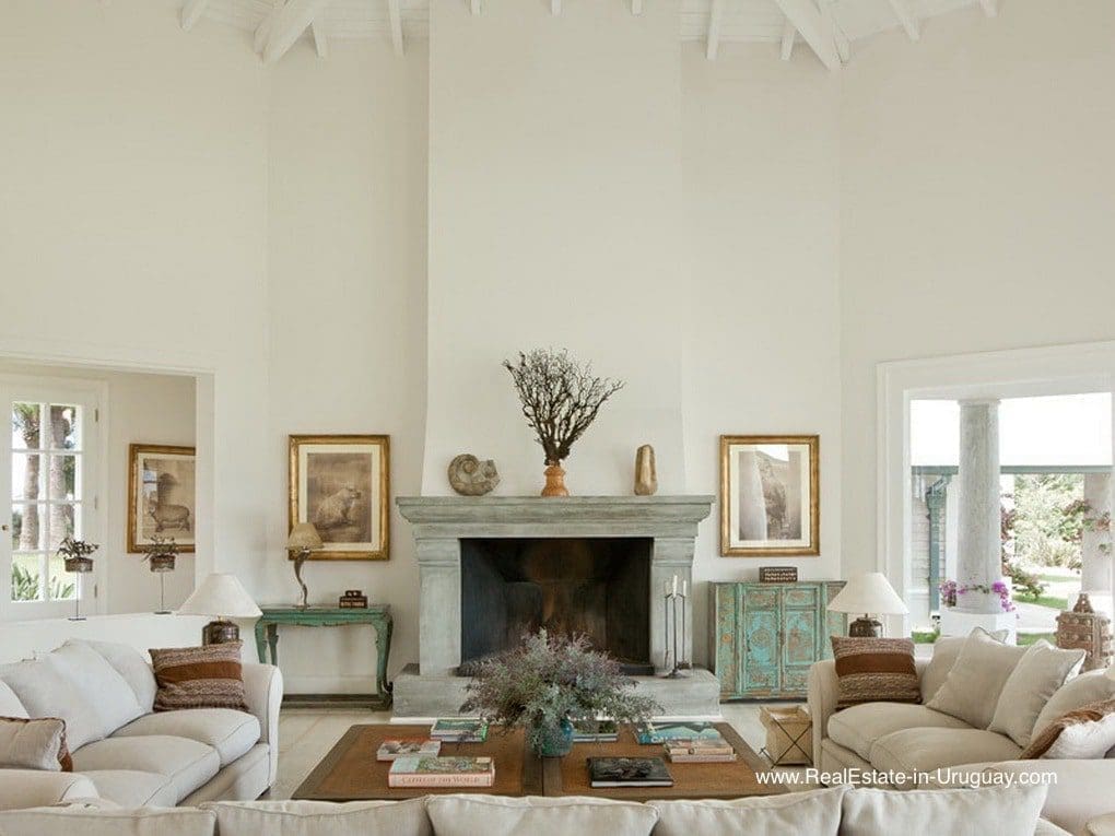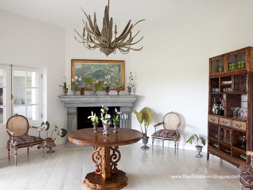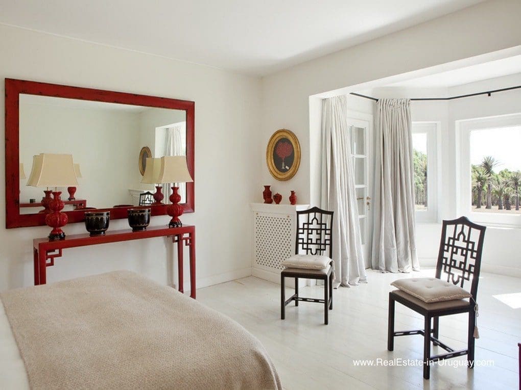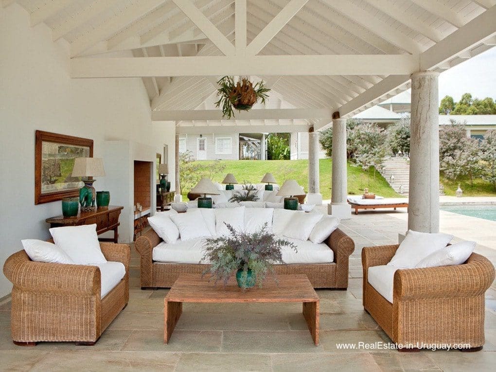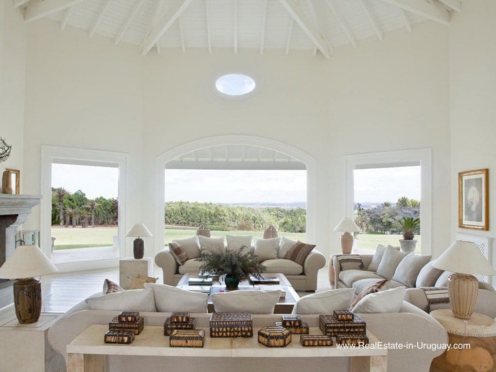 This unique country style ranch by Golf Course La Barra is located in the most prestigious area of touristic fincas in Punta del Este and just five minutes away from La Barra. This spectacular residence of more than 1,000m2 on a five-hectare plot is harmoniously integrated into its rural surroundings and the varied elevation of the land offers stunning sunset views. The entire grounds are landscaped with attention to detail to blend in with the natural topography of the land, which includes two reservoirs and a large pond at the main entrance. The house comprises spacious rooms and consists of a main hall with guest bathroom and coat rack, large living room, spacious dining room with direct access to the kitchen through a large room with wine cellar, private second living room, large covered BBQ and extensive covered deck serving as a pathway between the outside garden, the main living room, dining room and private living room. The first floor consists of a rectangular covered viewpoint with fireplace. The south wing comprises a second entrance hall with stairway to the top floor, four suites with exterior terraces, study and gazebo in the garden. The top floor consists of spacious master suite with dressing room and study with balcony. There is also a large 17x7m large swimming pool with spacious perimeter terrace, large covered pool house with heating and changing rooms for men and ladies plus a steam room. The property also comprises two exterior guest suites, staff house with living room, kitchen/dining room, two bathrooms and three bedrooms, garage, utility room and complete caretaker’s lodge. This is without doubt a unique and exclusive property, ideal for those seeking the peace and quiet of the countryside just a few minutes from Punta del Este, La Barra and José Ignacio.