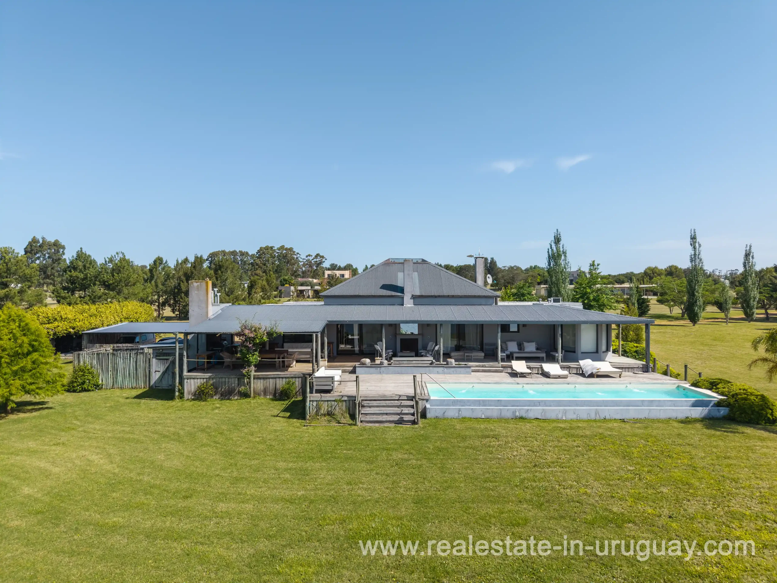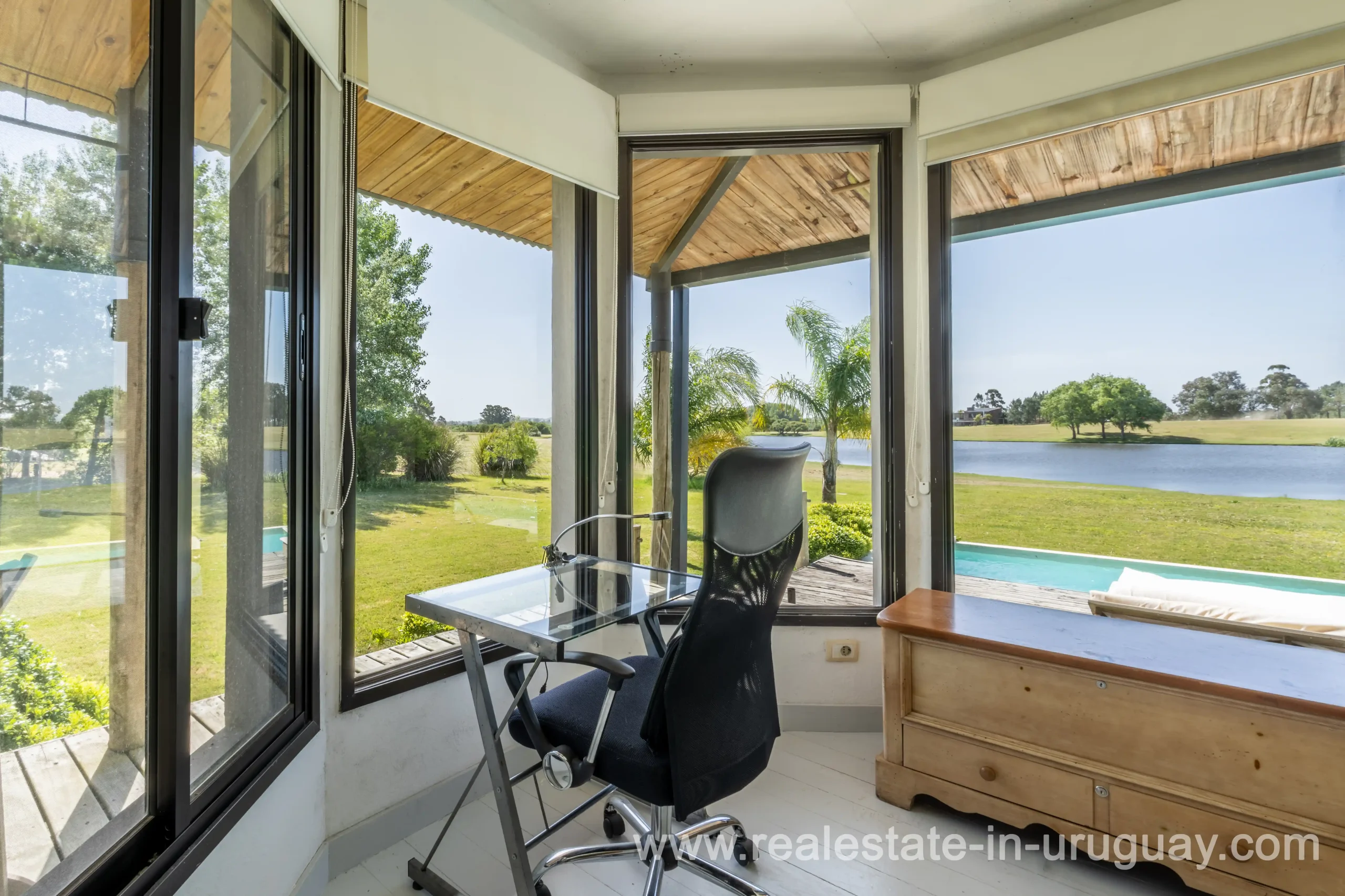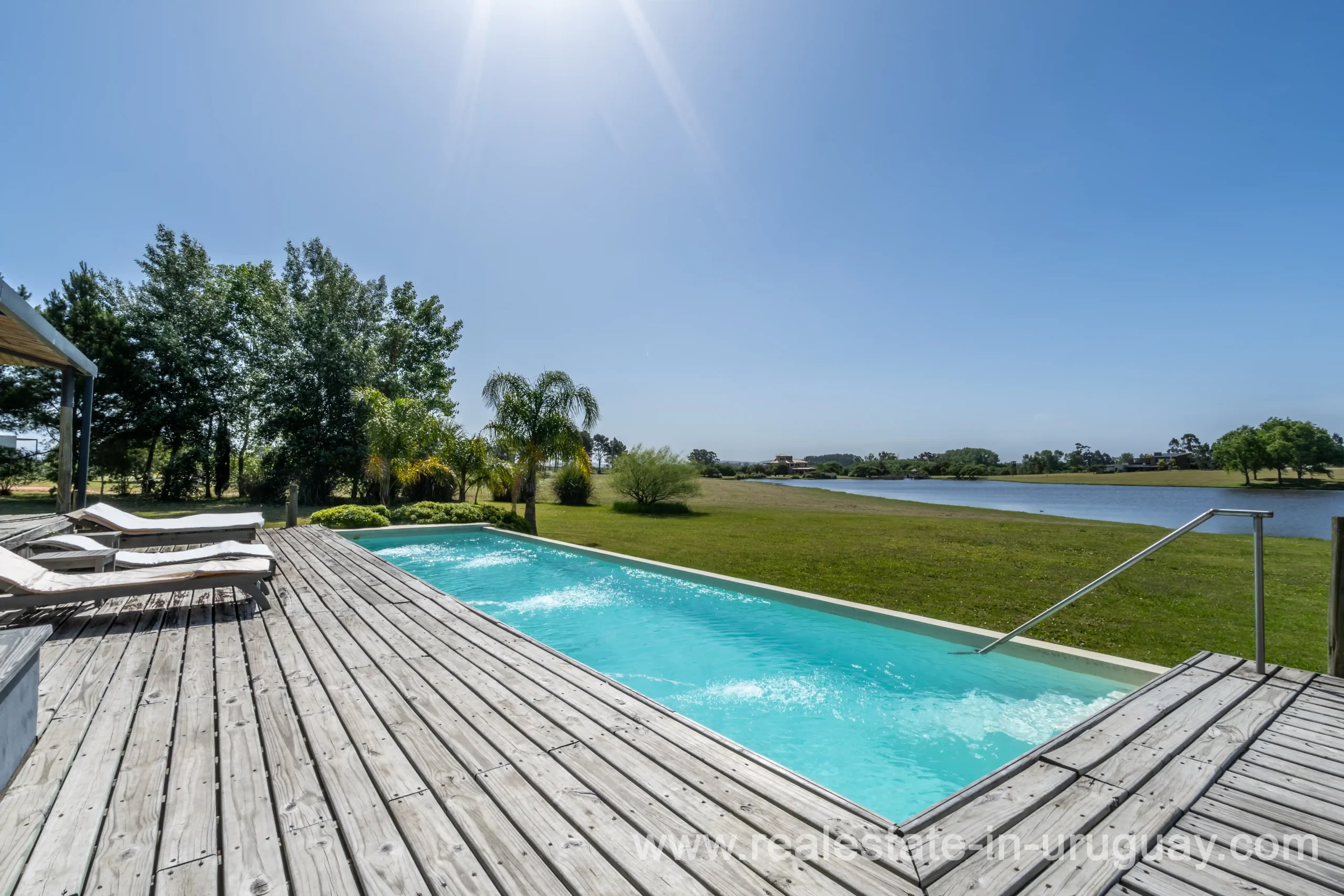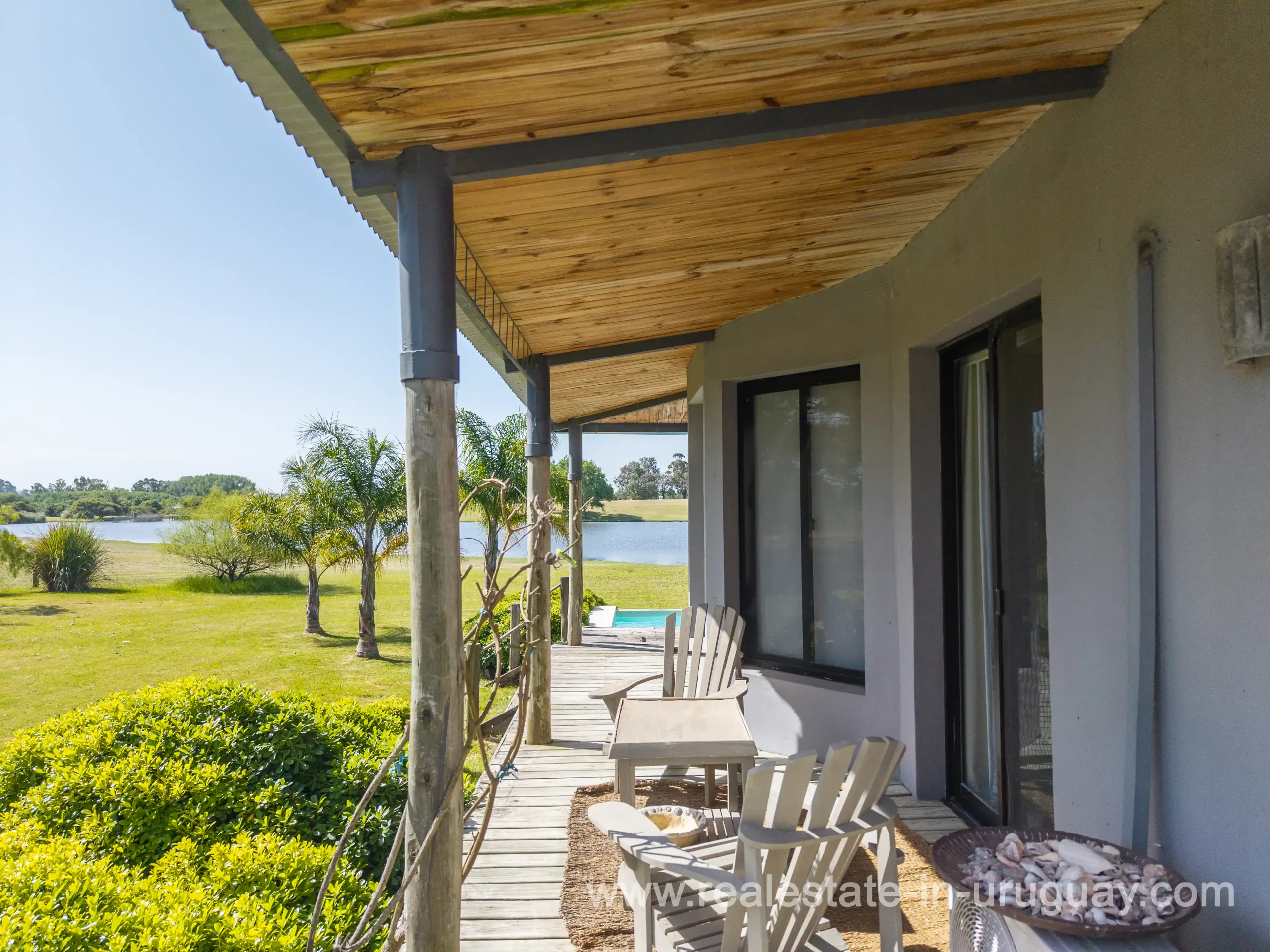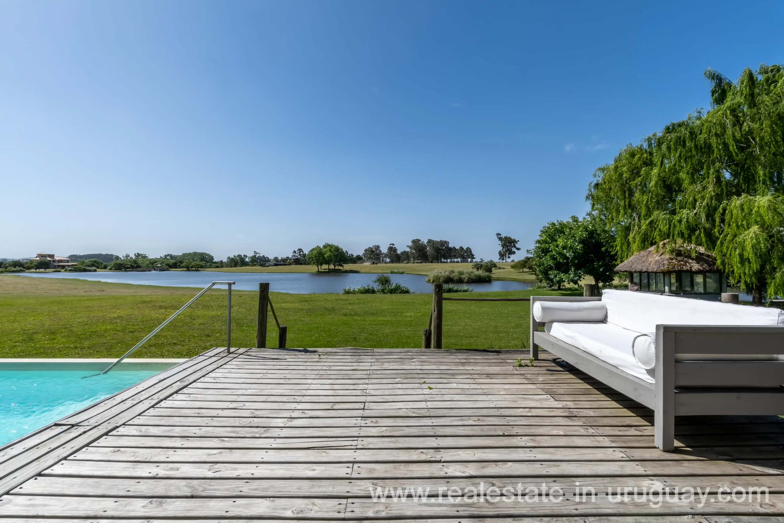 In the private gated community El Quijote, ten minutes from La Barra, we offer this property in a unique location within the private neighborhood. On first impression, its direct view of the central lagoon stands out, plus the vegetation that surrounds it and the sunset behind it due to its northwest orientation. The construction, designed by the renowned architect Pachi Firpo, combines perfectly with nature. It has a very spacious deck with a barbecue/grill and different areas for chairs and tables, plus a pool, overlooking the lagoon. As for its layout, it consists of a spacious living/dining room in the center, plus a recently renovated defined kitchen. At the sides, there are two bedrooms with en suite bathrooms in each wing, totaling four bedrooms. Of those, two have double beds, and two, have single beds. Also, next to the kitchen, there is a staff bedroom with a bathroom. There is also a complete laundry room to one side next to the open-covered garage. The construction is traditional and very well-maintained, and the house is naturally bright due to its windows and skylights. The house has two lots, one on which it is situated, and one at the rear. Contact us for more information.