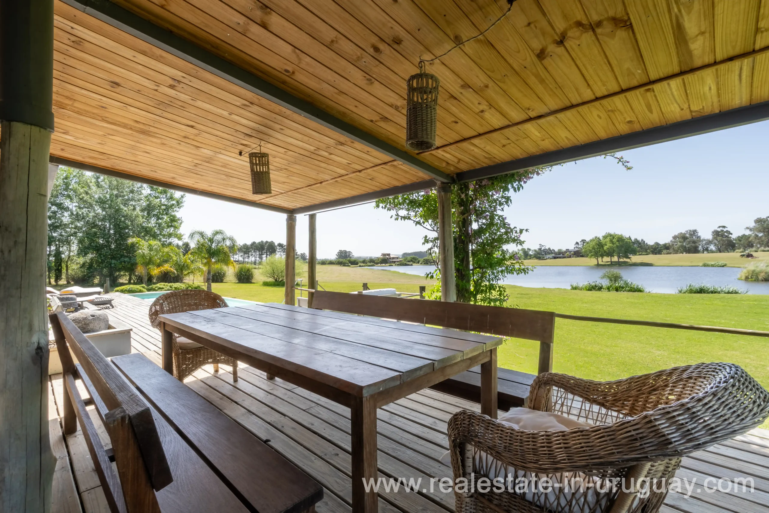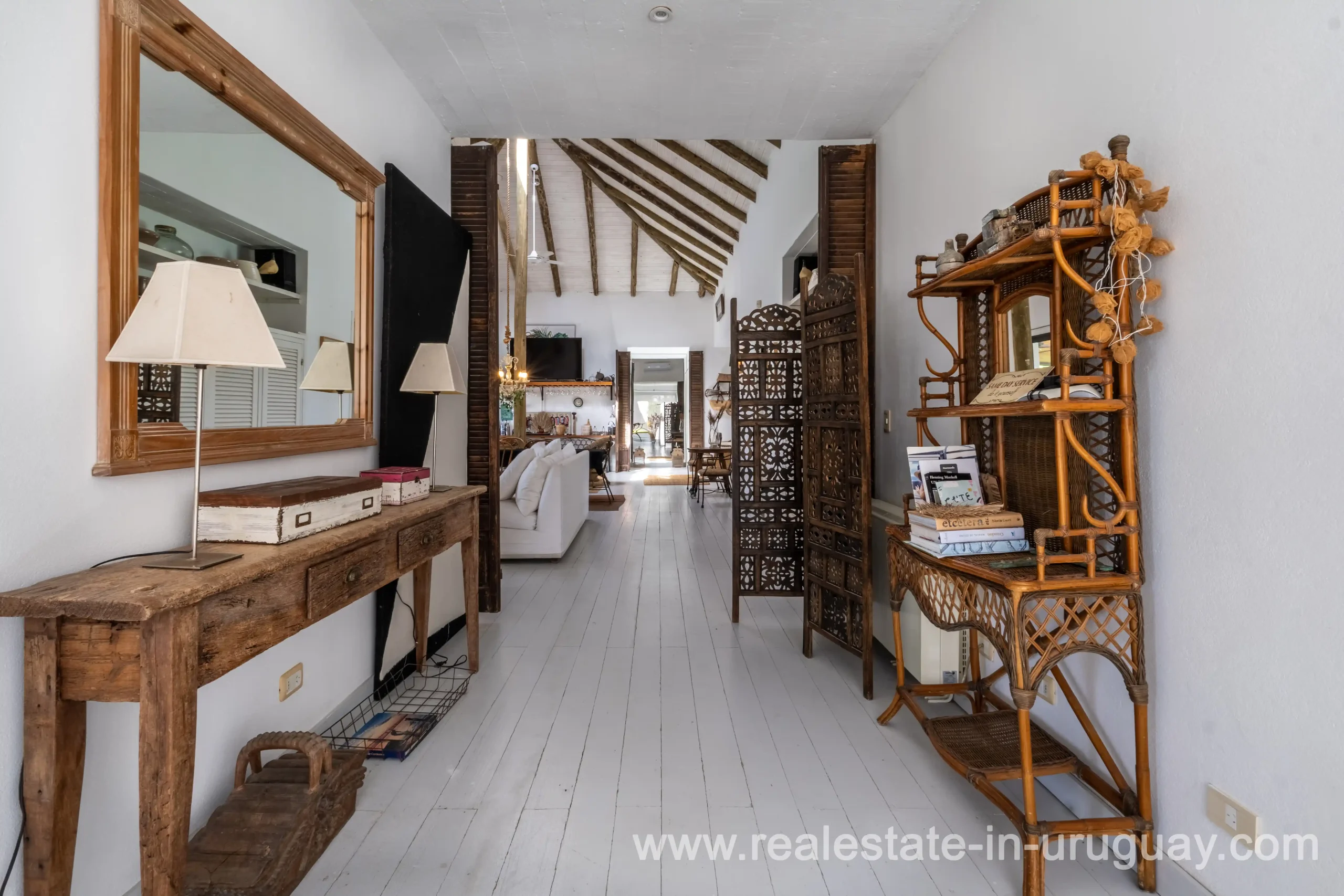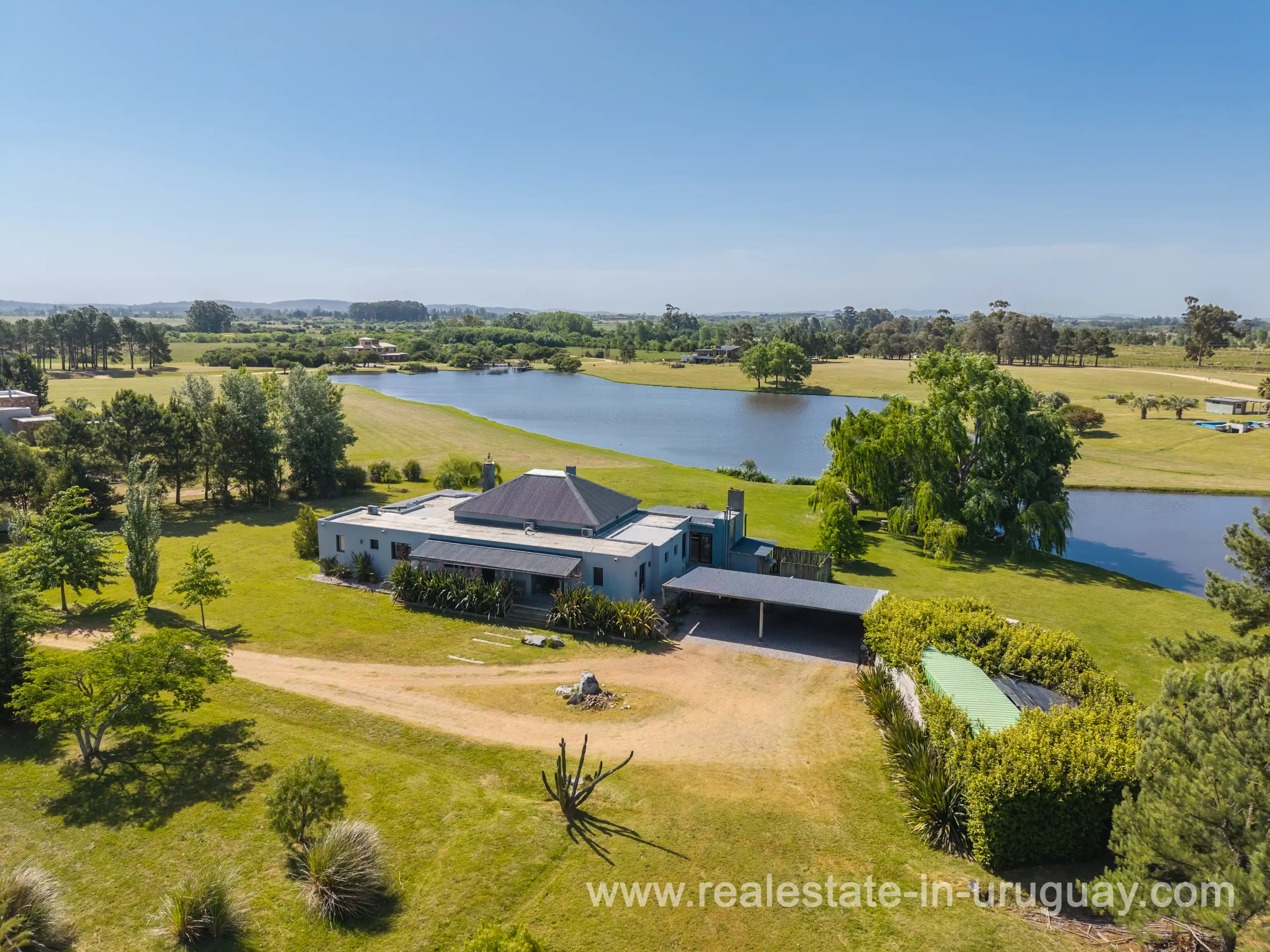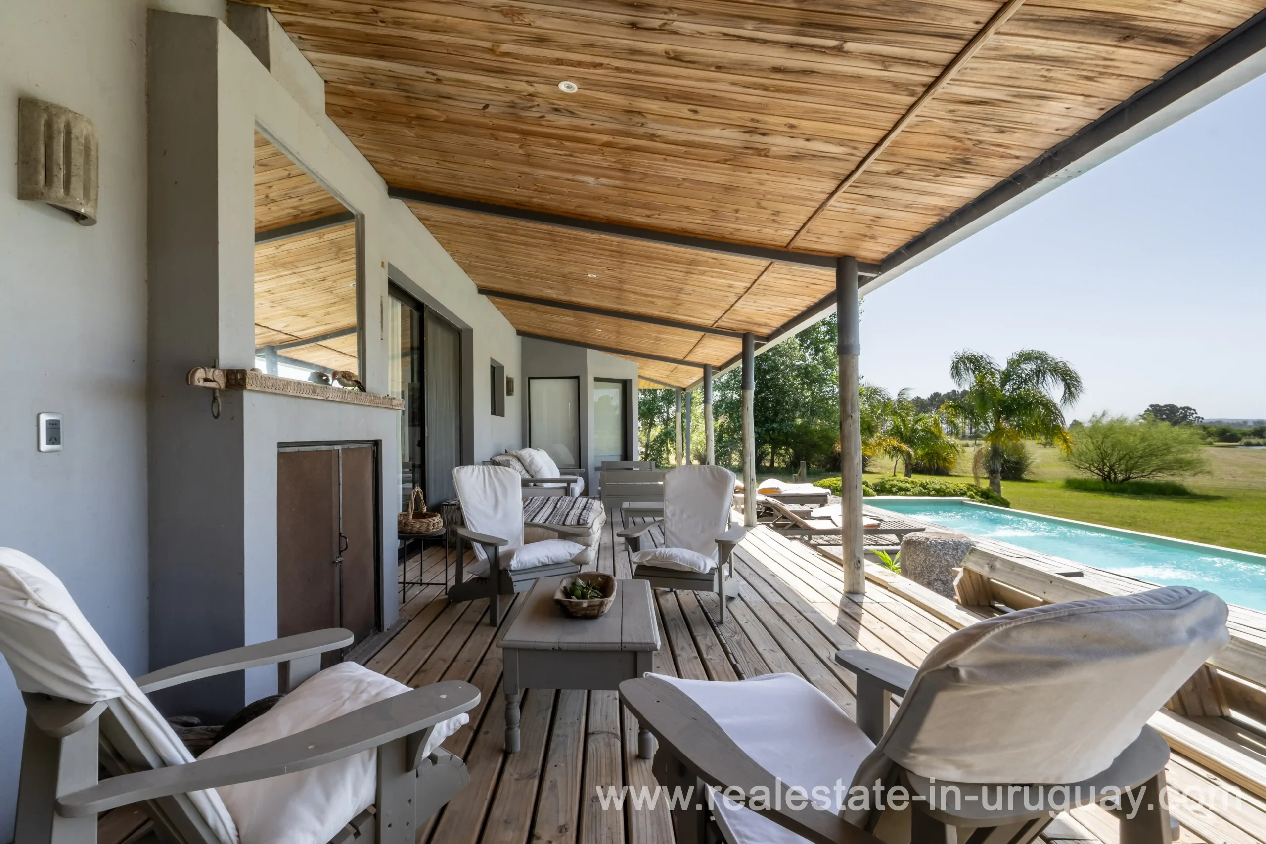 In the private gated community El Quijote, ten minutes from La Barra, we offer this property in a unique location within the private neighborhood. On first impression, its direct view of the central lagoon stands out, plus the vegetation that surrounds it and the sunset behind it due to its northwest orientation. The construction, designed by the renowned architect Pachi Firpo, combines perfectly with nature. It has a very spacious deck with a barbecue/grill and different areas for chairs and tables, plus a pool, overlooking the lagoon. As for its layout, it consists of a spacious living/dining room in the center, plus a recently renovated defined kitchen. At the sides, there are two bedrooms with en suite bathrooms in each wing, totaling four bedrooms. Of those, two have double beds, and two, have single beds. Also, next to the kitchen, there is a staff bedroom with a bathroom. There is also a complete laundry room to one side next to the open-covered garage. The construction is traditional and very well-maintained, and the house is naturally bright due to its windows and skylights. The house has two lots, one on which it is situated, and one at the rear. Contact us for more information.