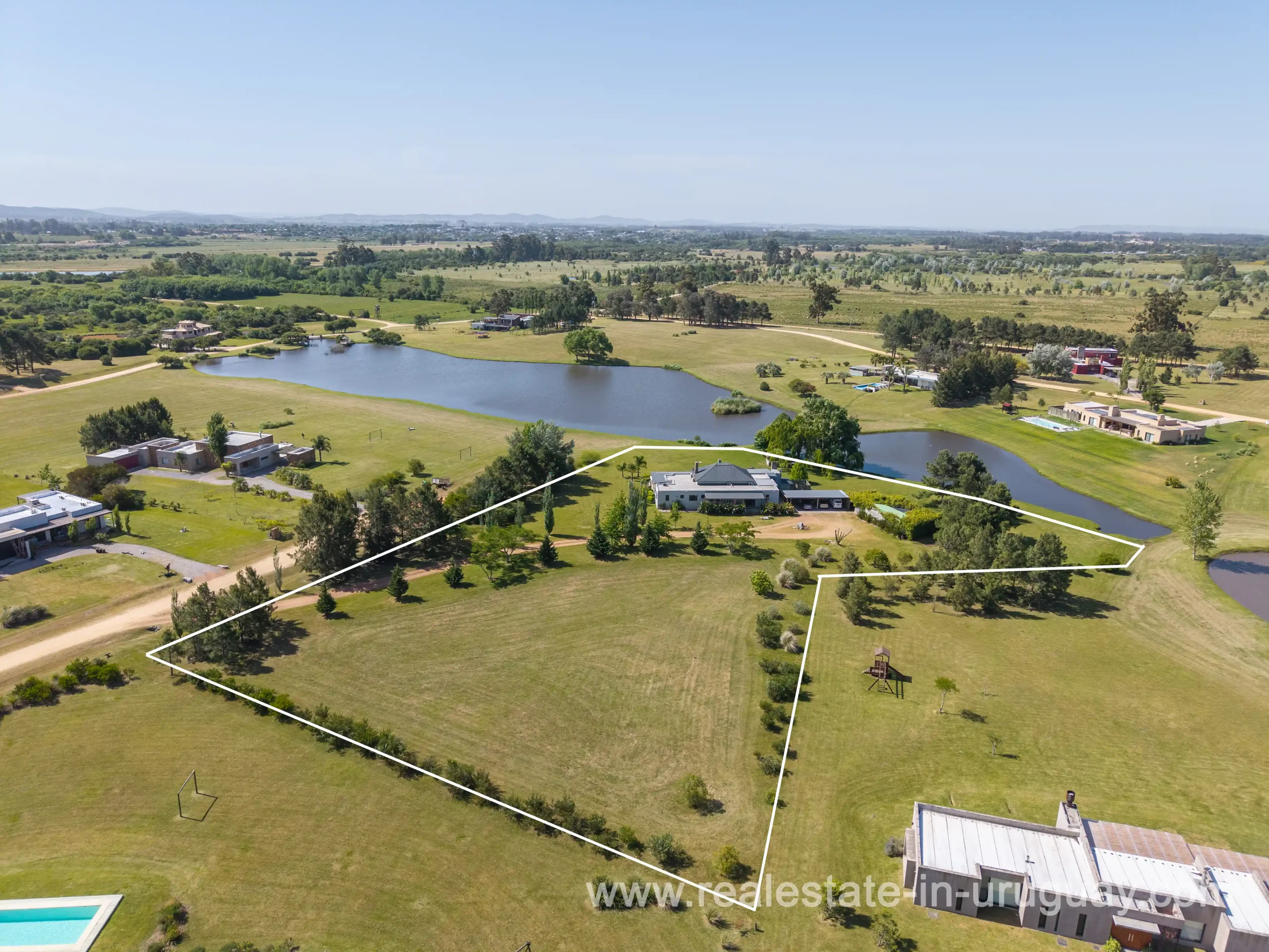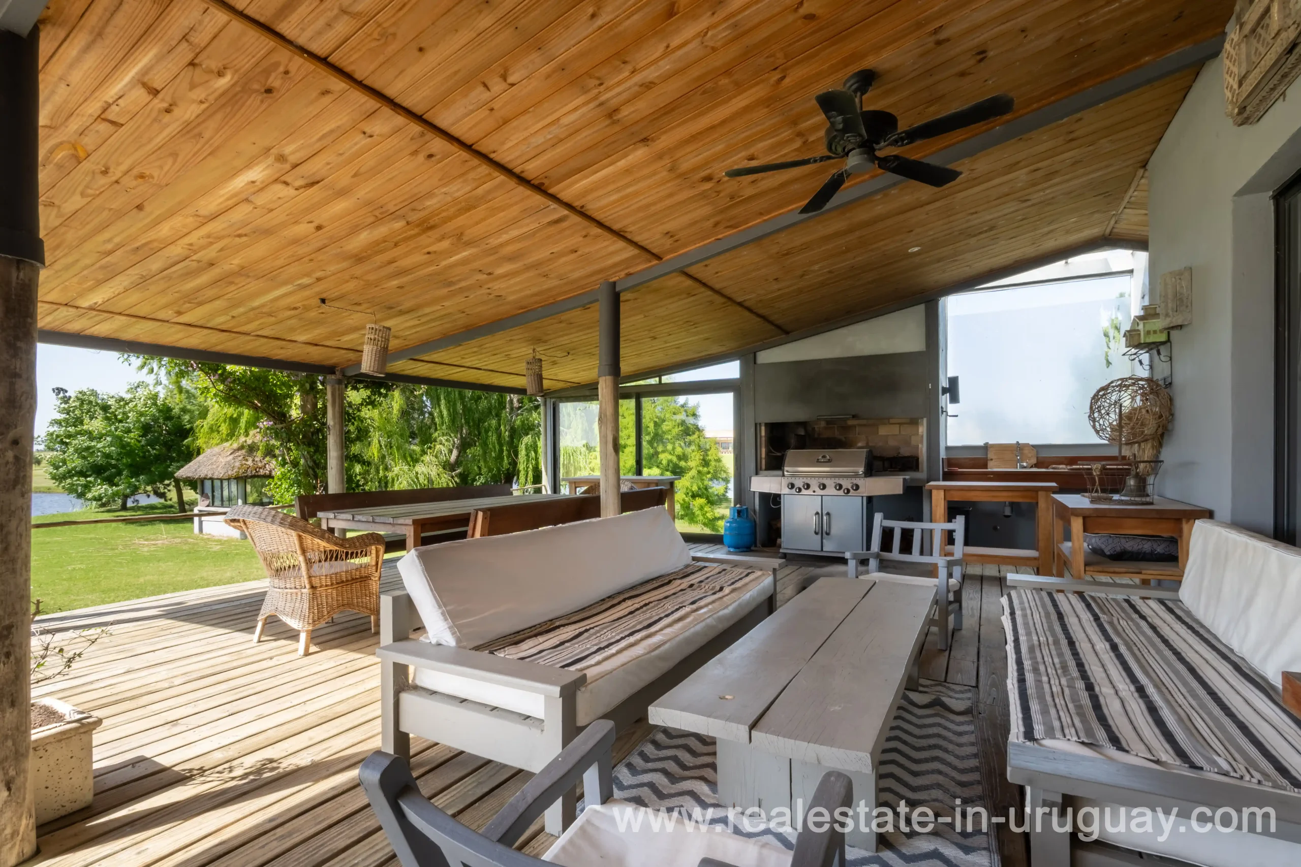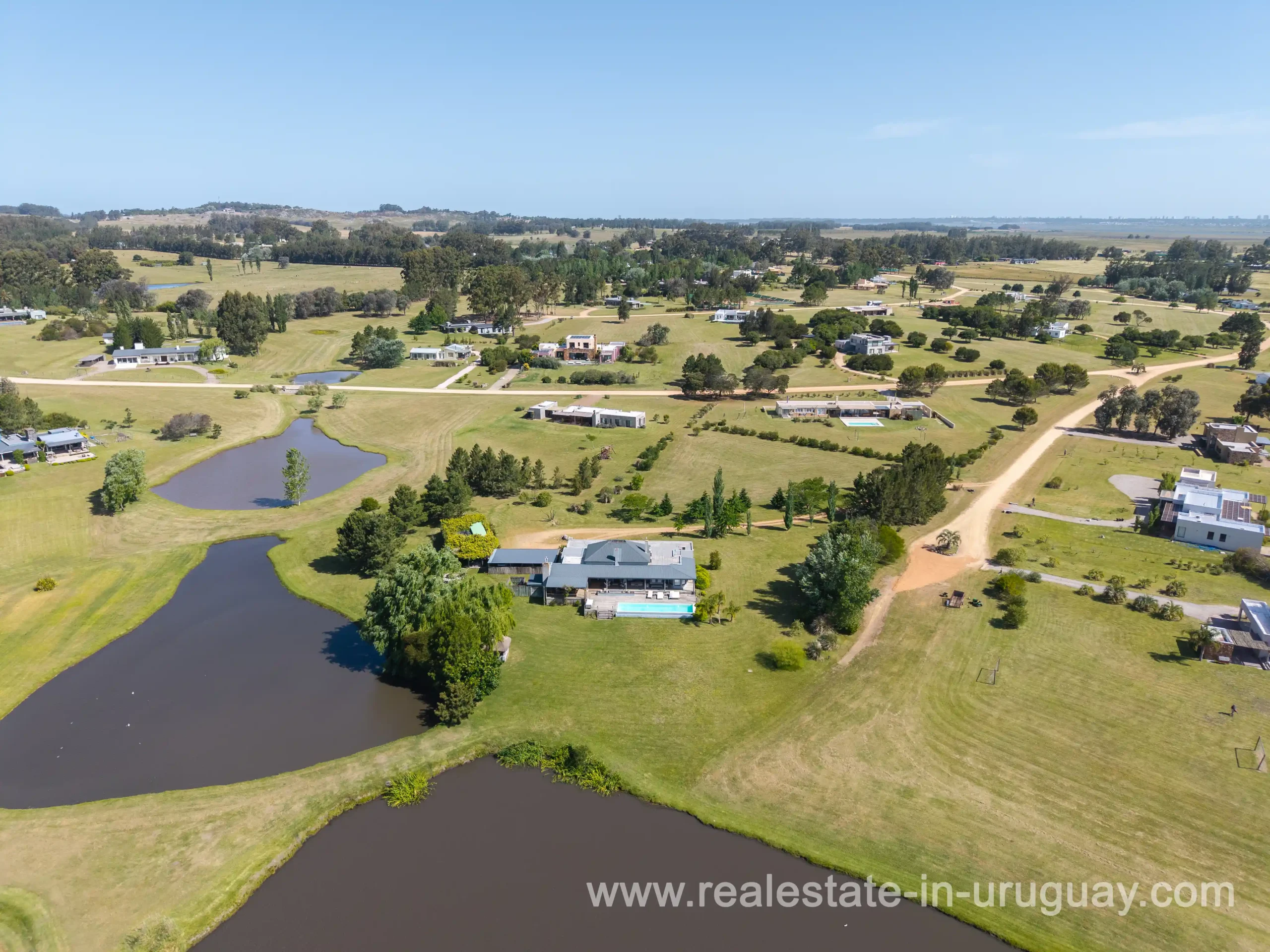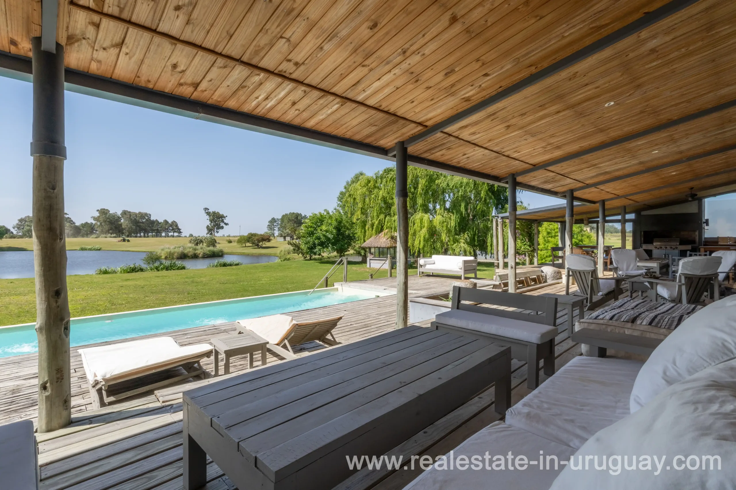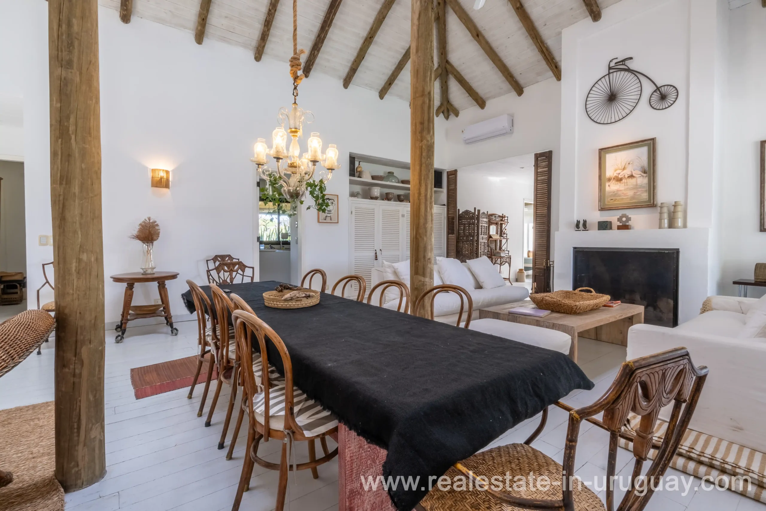 In the private gated community El Quijote, ten minutes from La Barra, we offer this property in a unique location within the private neighborhood. On first impression, its direct view of the central lagoon stands out, plus the vegetation that surrounds it and the sunset behind it due to its northwest orientation. The construction, designed by the renowned architect Pachi Firpo, combines perfectly with nature. It has a very spacious deck with a barbecue/grill and different areas for chairs and tables, plus a pool, overlooking the lagoon. As for its layout, it consists of a spacious living/dining room in the center, plus a recently renovated defined kitchen. At the sides, there are two bedrooms with en suite bathrooms in each wing, totaling four bedrooms. Of those, two have double beds, and two, have single beds. Also, next to the kitchen, there is a staff bedroom with a bathroom. There is also a complete laundry room to one side next to the open-covered garage. The construction is traditional and very well-maintained, and the house is naturally bright due to its windows and skylights. The house has two lots, one on which it is situated, and one at the rear. Contact us for more information.